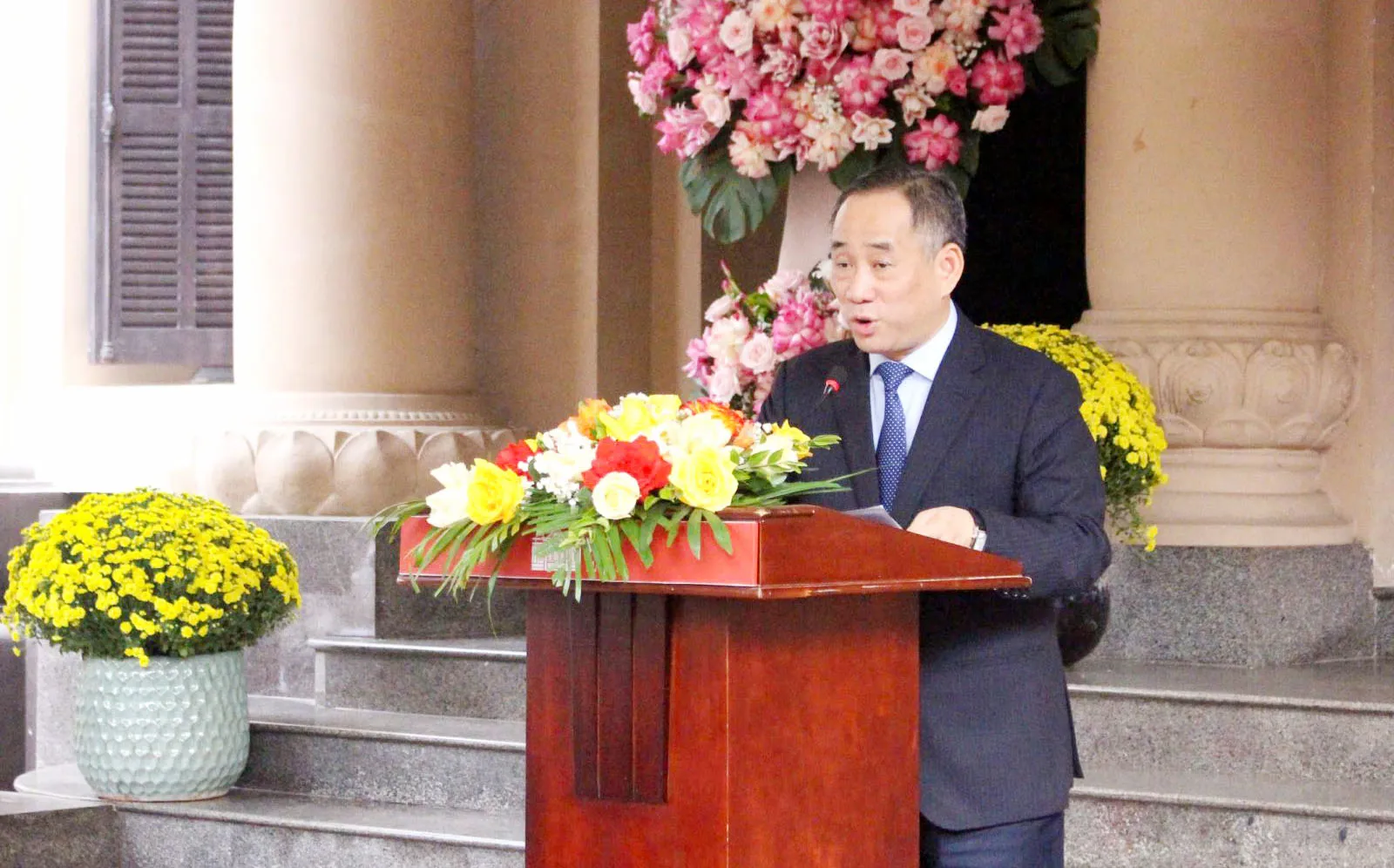 Giám đốc Bảo tàng Mỹ thuật Việt Nam Nguyễn Anh Minh phát biểu tại lễ khai mạc triển lãm. Ảnh: Hồng Phượng.