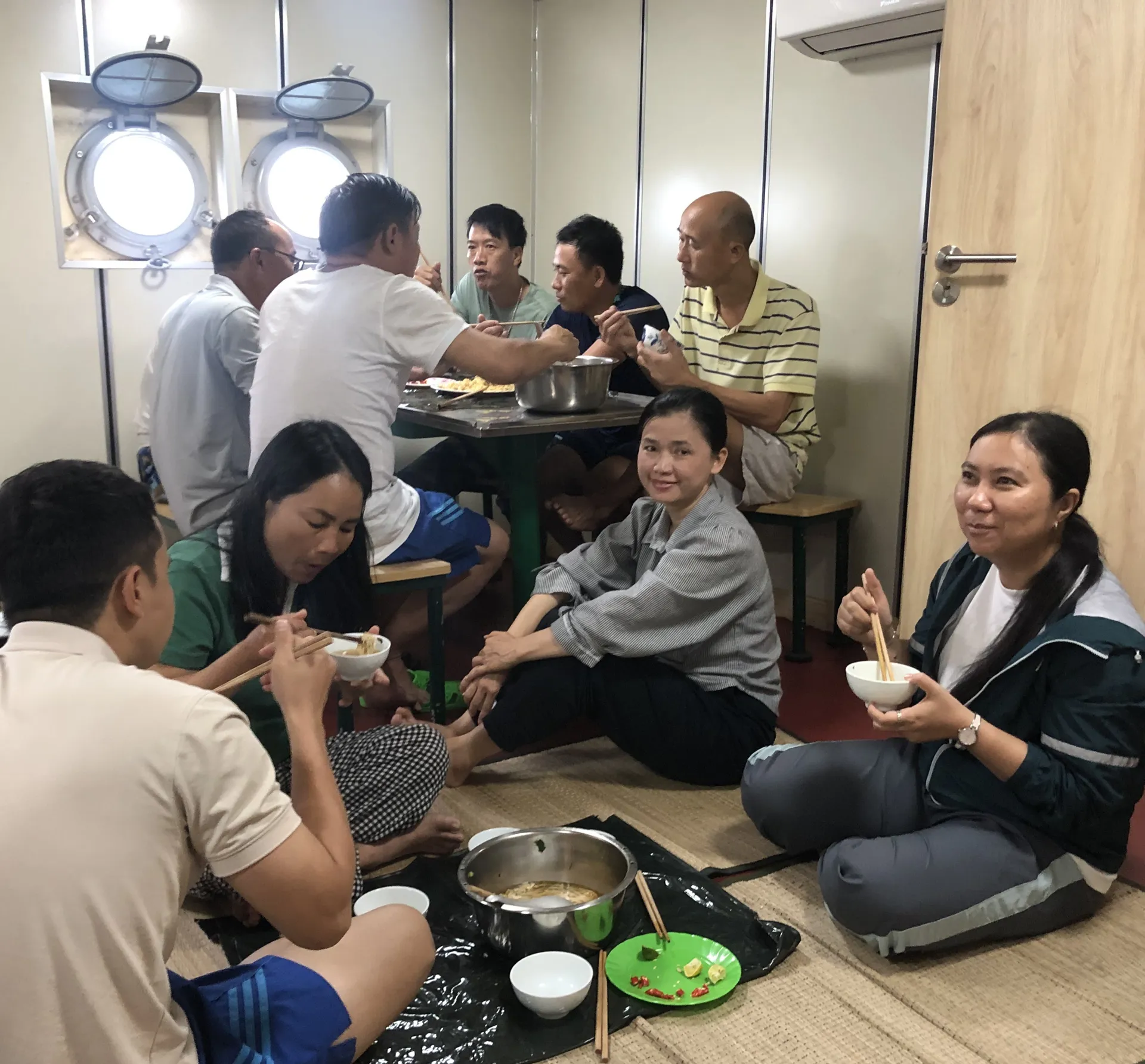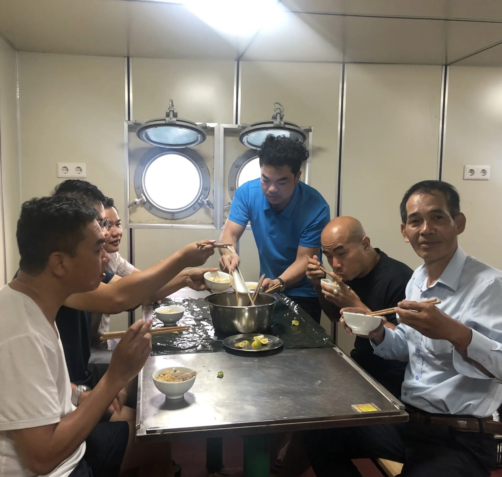 Mỗi mâm cơm trên tàu quy định 6 người, nhưng với đoàn công tác số 1 đi trên tàu Trường Sa 01, ai cũng có cảm giác ngồi ăn cơm chung càng đông càng vui. Do đó, có những bữa cơm đến 7-8 người ngồi cùng mâm, vừa ăn vừa trò chuyện rôm rả.