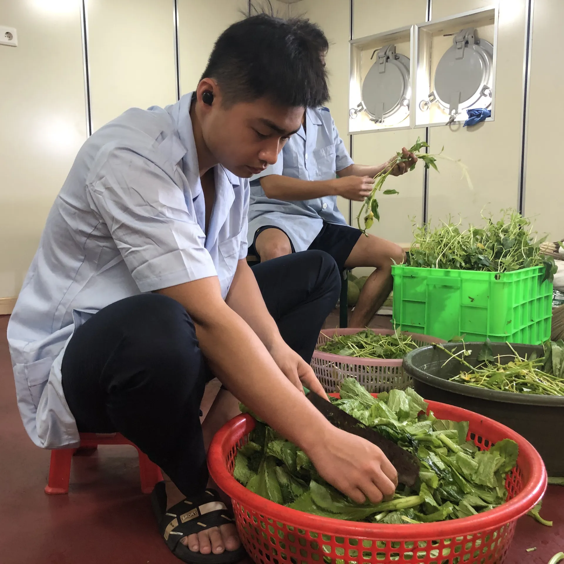 Để có bữa cơm với những món ăn ngon, ngay từ sớm bộ phận nhà bếp đã chọn rau, chuẩn bị nguyên liệu.