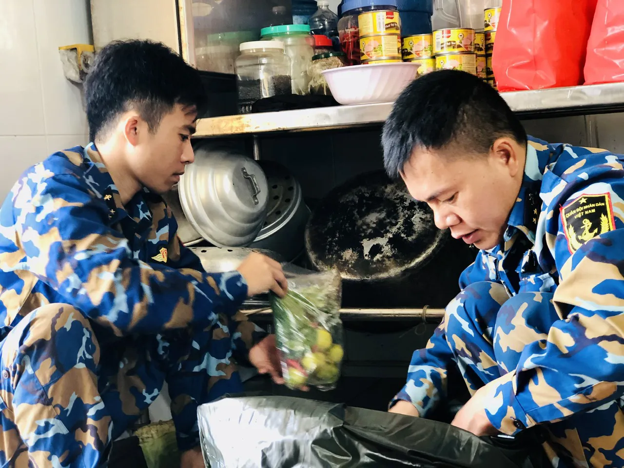 Trong suốt chuyến hải trình, chế độ ăn uống trên tàu Trường Sa 01, dành cho đoàn công tác và cán bộ, chiến sĩ của tàu, không những no mà còn đầy đủ dinh dưỡng. Mỗi ngày, bộ phận nhà bếp của tàu phục vụ 4 bữa ăn: sáng, trưa, chiều và tối.