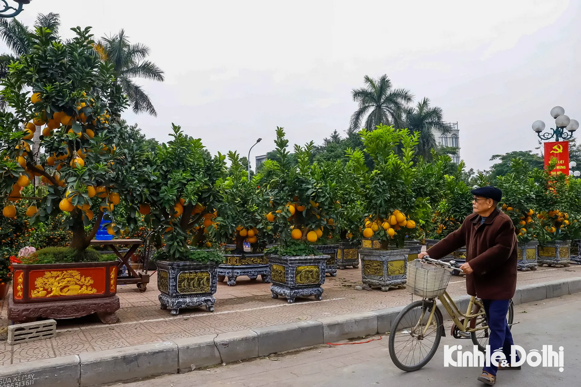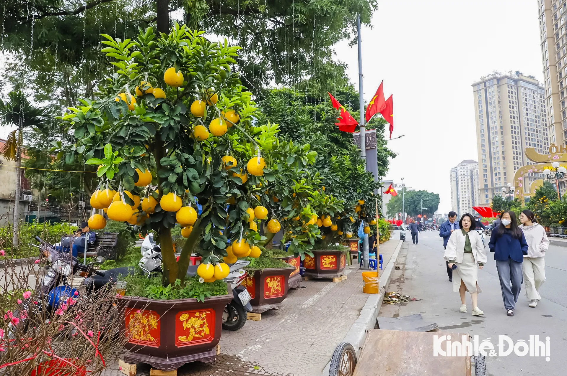 Được mệnh danh là “con đường cây cảnh” sầm uất bậc nhất Thủ đô mỗi dịp Tết đến, phố Lạc Long Quân những ngày này gần như kín chỗ trưng bày đào, quất, mai và đặc biệt là bưởi cổ thụ sai trĩu quả. Những gốc bưởi thế lớn, tán tròn đều, quả vàng óng ánh, lá xanh mướt thu hút ánh nhìn của người đi đường.