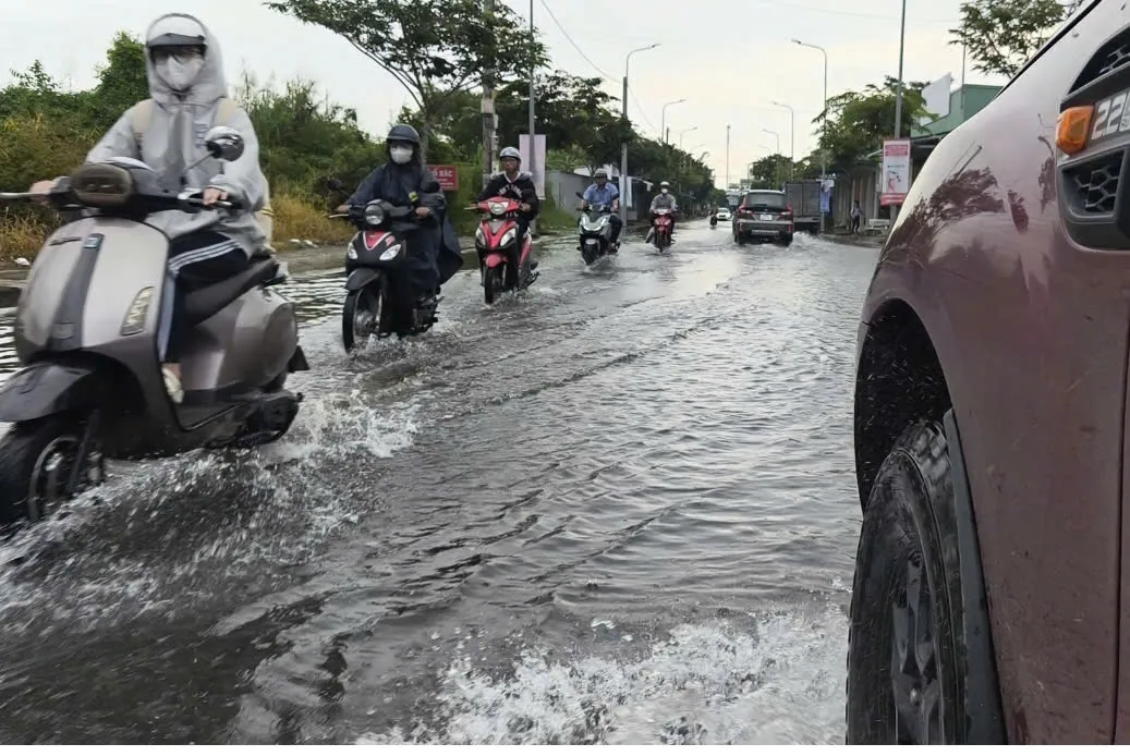 Mưa lớn kèm triều cường đã gây ngập sâu và kéo dài hàng trăm mét đường Hòa Bình phường Bạc Liêu (đoạn gần với đường Tôn Đức Thắng). Ảnh Hoàng Nam