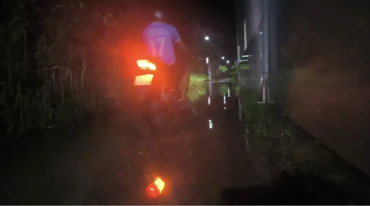 Đường Rạch Ông Bổn phường Vĩnh Trạch đêm 25, 26/10/2025. Đoạn đường này nhiều điểm úng ngập nhưng không có đèn đường, gây nguy hiểm cho người dân địa phương. Ảnh Hoàng Nam.