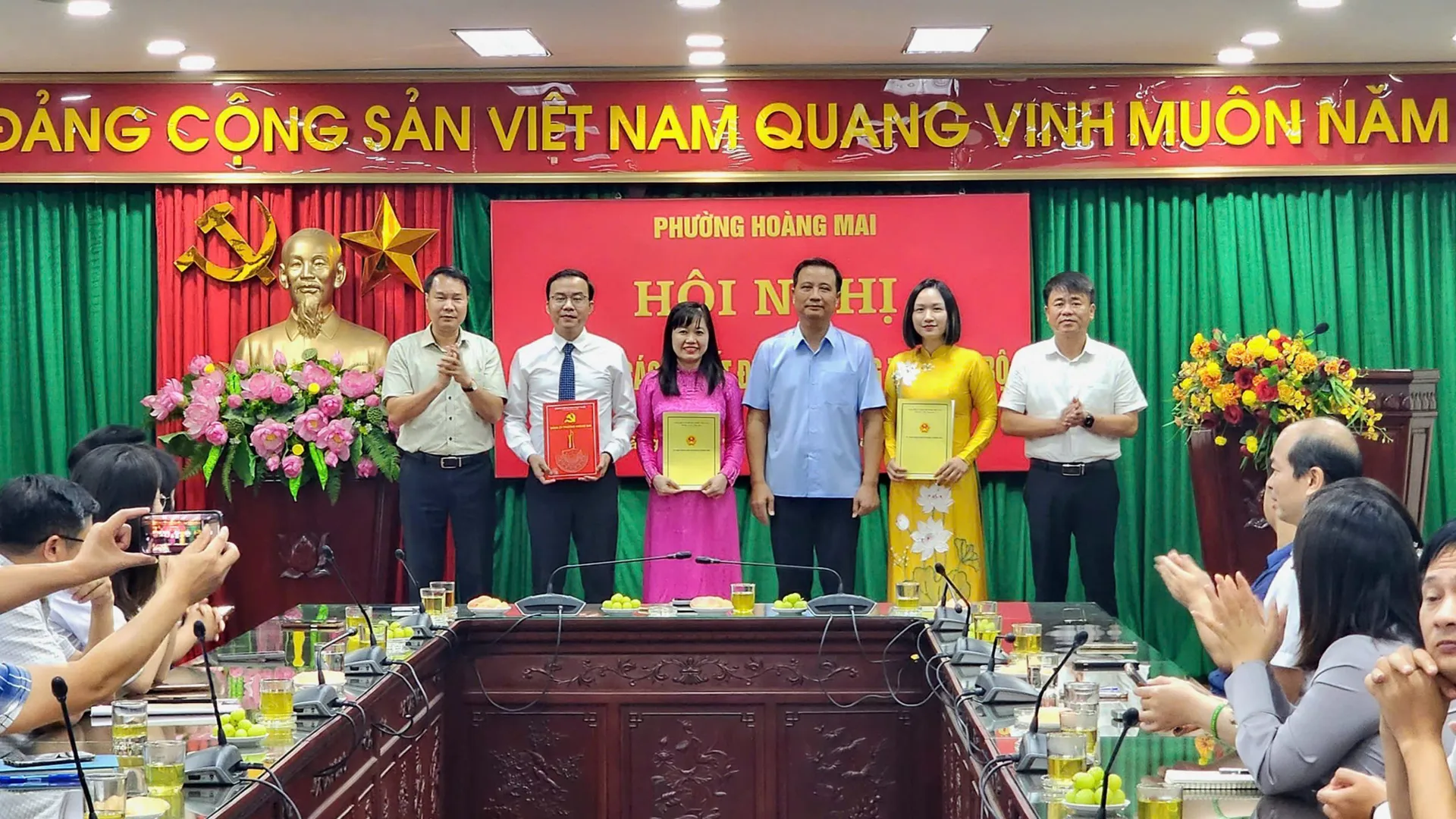 Trước đó, Đảng ủy và UBND phường Hoàng Mai đã triển khai 3 quyết định bổ nhiệm nhân sự. Phó Chánh Văn phòng Đảng ủy phường Hoàng Mai Võ Minh Phương được bổ nhiệm Chánh Văn phòng Đảng ủy phường. Bà Lê Phương Dung làm Phó Trưởng phòng Văn hóa - Xã hội và đồng chí Nguyễn Thị Thu Hương được bổ nhiệm làm Phó Trưởng phòng Kinh tế, Hạ tầng và Đô thị. Đây đều là những cán bộ có năng lực chuyên môn, phẩm chất đạo đức tốt, có cống hiến trong công tác và được ghi nhận.