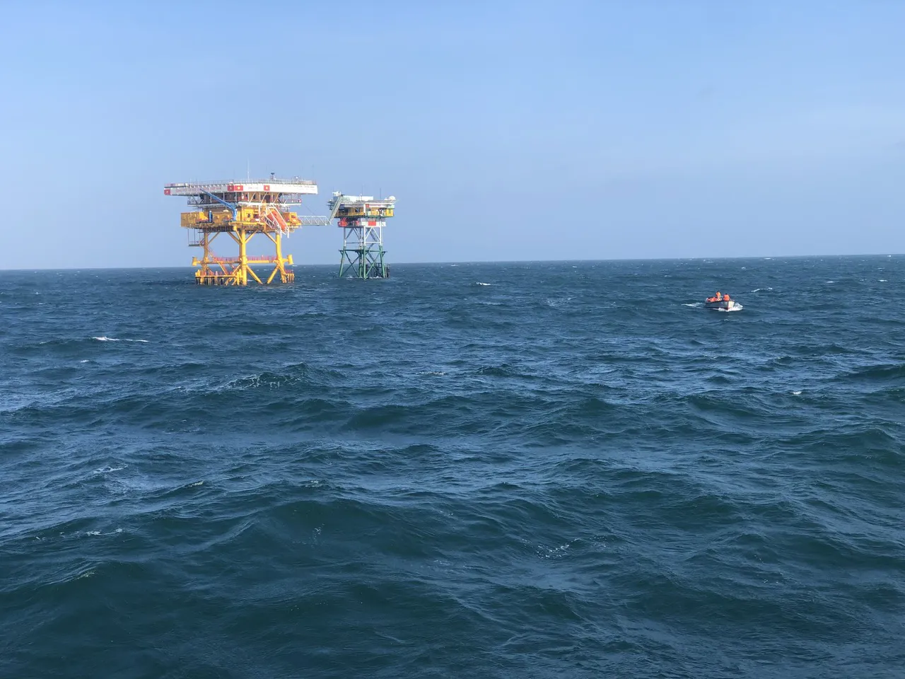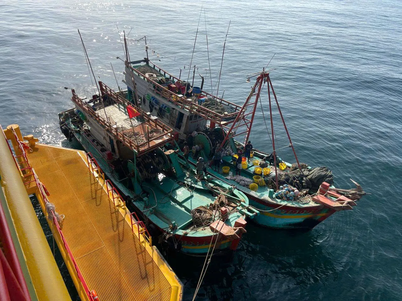 Tàu cá BT93535TS và BT97903TS cập Nhà giàn DK1 - 10, để nhờ hỗ trợ cấp cứu ngư dân. Ảnh: Văn Đường