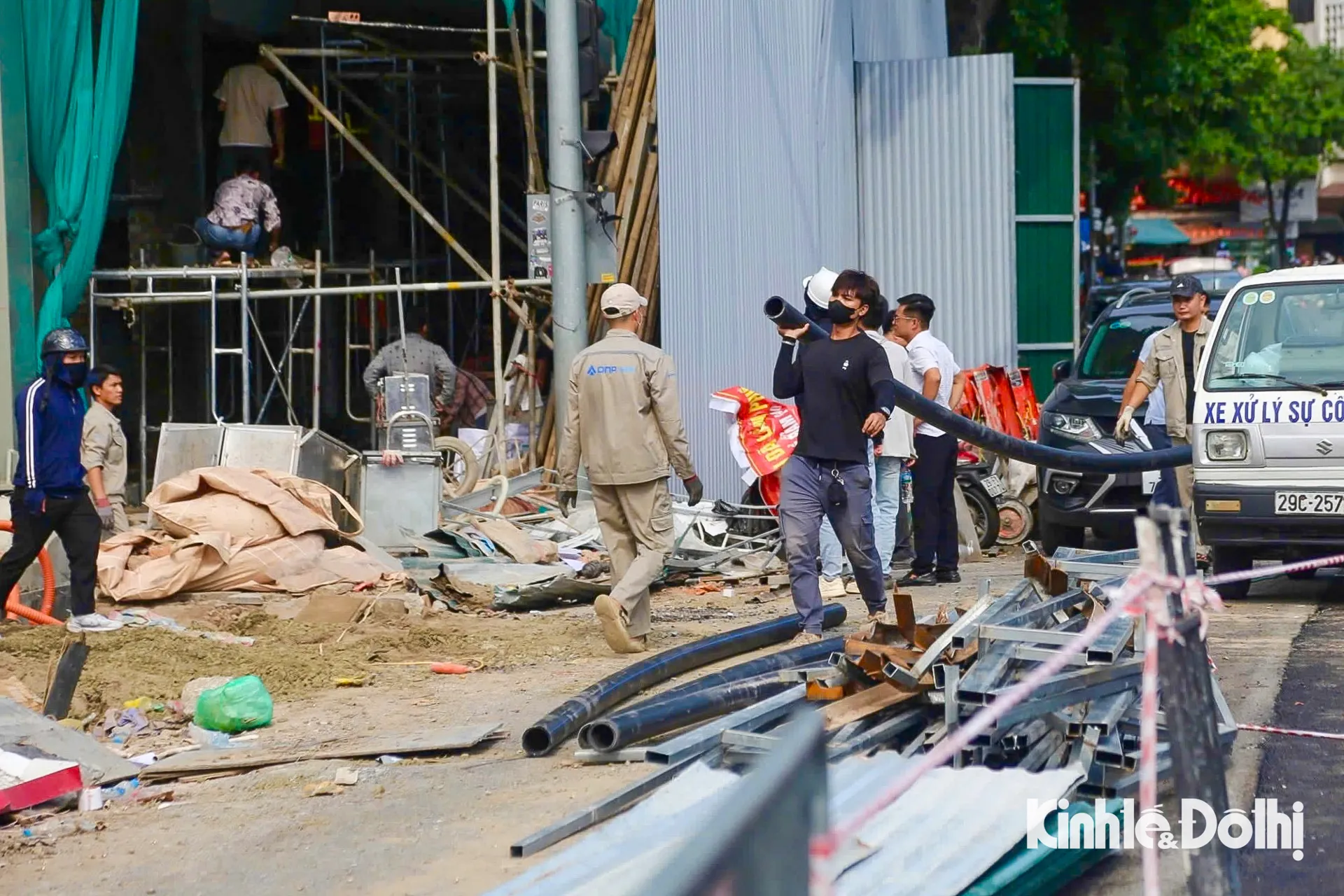 Kinhtedothi – Ngày 25/5, các công nhân đang tiến hành dựng khung rào chắn tòa nhà “Hàm Cá Mập” (số 7 Đinh Tiên Hoàng, quận Hoàn Kiếm, Hà Nội) để chuẩn bị phá dỡ tòa nhà.