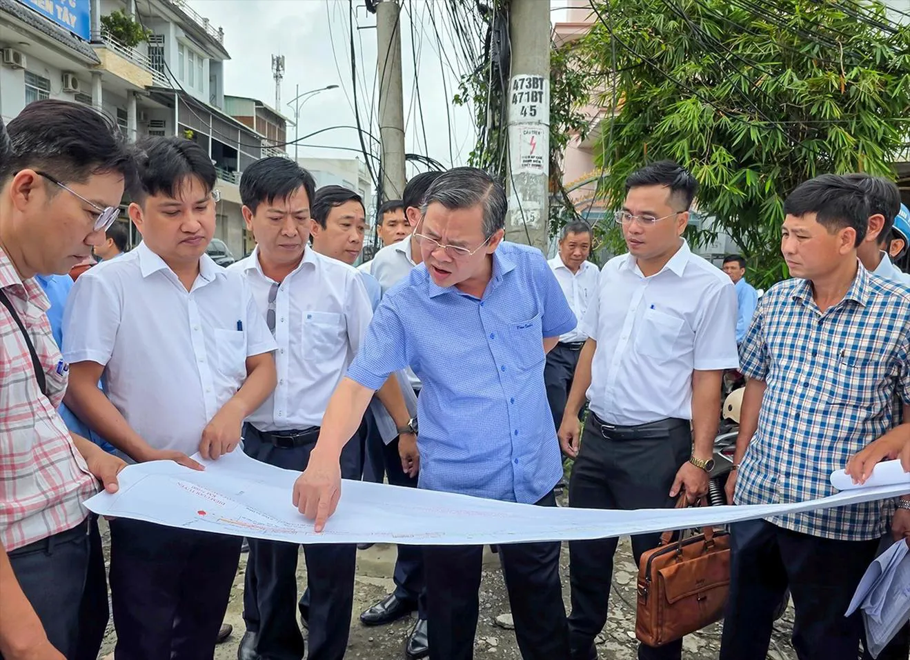 Chủ tịch UBND TP Trương Cảnh Tuyên kiểm tra, chỉ đạo tháo gỡ khó khăn, vướng mắc trong công tác bồi thường, hỗ trợ, tái định cư dự án Nâng cấp, mở rộng Quốc lộ 91 (đoạn Km0-Km7). Ảnh: thanhuycantho
