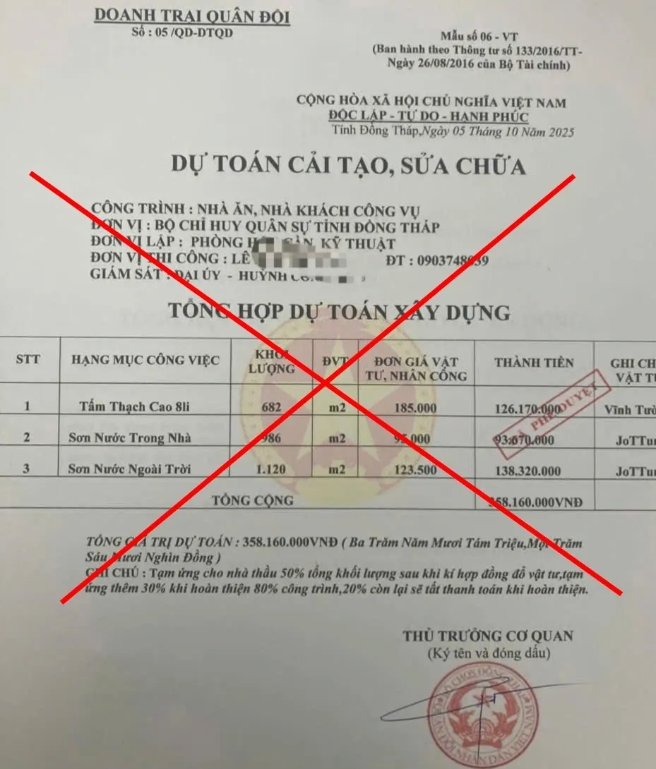 Đối tượng này yêu cầu phía doanh nghiệp xây dựng dự toán, báo giá, thậm chí yêu cầu phía doanh nghiệp ứng tiền mua khẩn cấp một số thiết bị theo địa chỉ giới thiệu trước. Để tạo lòng tin cho “đối tác”, đối tượng này còn cung cấp văn bản có ghi tên, chữ ký một lãnh đạo Bộ chỉ huy Quân sự và đóng dấu đỏ tên Bộ chỉ huy Quân sự tỉnh Đồng Tháp.