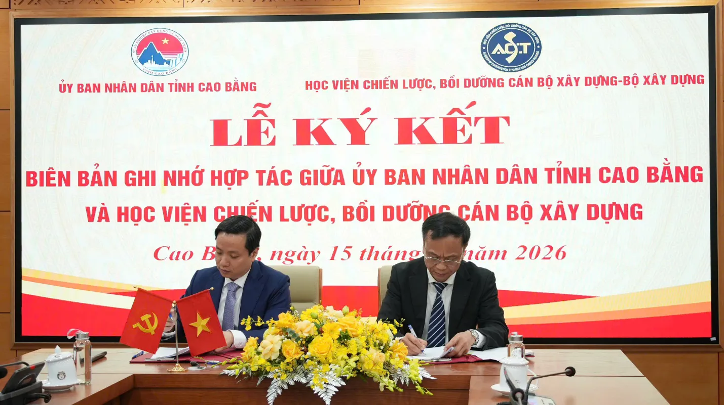 UBND tỉnh Cao Bằng và Học viện Chiến lược, bồi dưỡng cán bộ xây dựng ký kết Biên bản ghi nhớ hợp tác, tạo cơ sở triển khai hội thảo và các hoạt động phối hợp đào tạo trong thời gian tới.