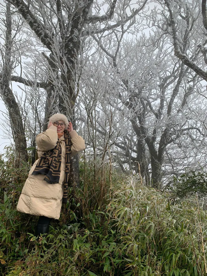 Du khách thích thú ghi lại khoảnh khắc băng giá phủ trắng cành cây, ngọn cỏ.
