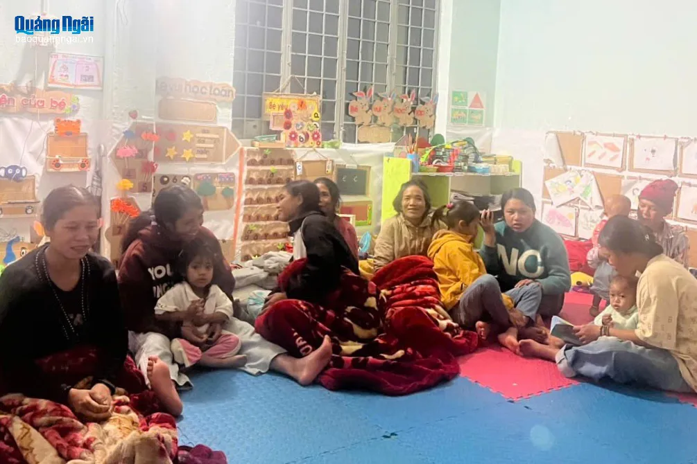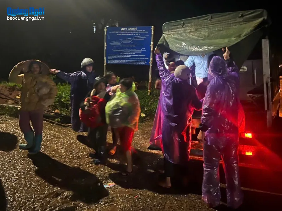 Xã Ba Vì, Quảng Ngãi di dời người dân trong đêm 6/11. Theo Chủ tịch UBND xã Ba Vì Thành Minh Thuận, khoảng 18 giờ 30 phút ngày 6/11, xã nhận được tin báo từ người dân và trưởng thôn Tà Noát báo cáo có dấu hiệu nứt núi Wang Với, nguy cơ sạt lở núi rất cao, có thể nguy hiểm đến các hộ dân dưới chân núi. Ngay sau đó, Ban Chỉ huy Phòng thủ dân sự xã Ba Vì đã khẩn trương chỉ đạo Tổ xung kích vận động 23 hộ dân, với 54 nhân khẩu, ra khỏi khu vực có nguy cơ sạt lở đi sơ tán, ở xen ghép nhà dân trong thôn. Ảnh: ĐPCC