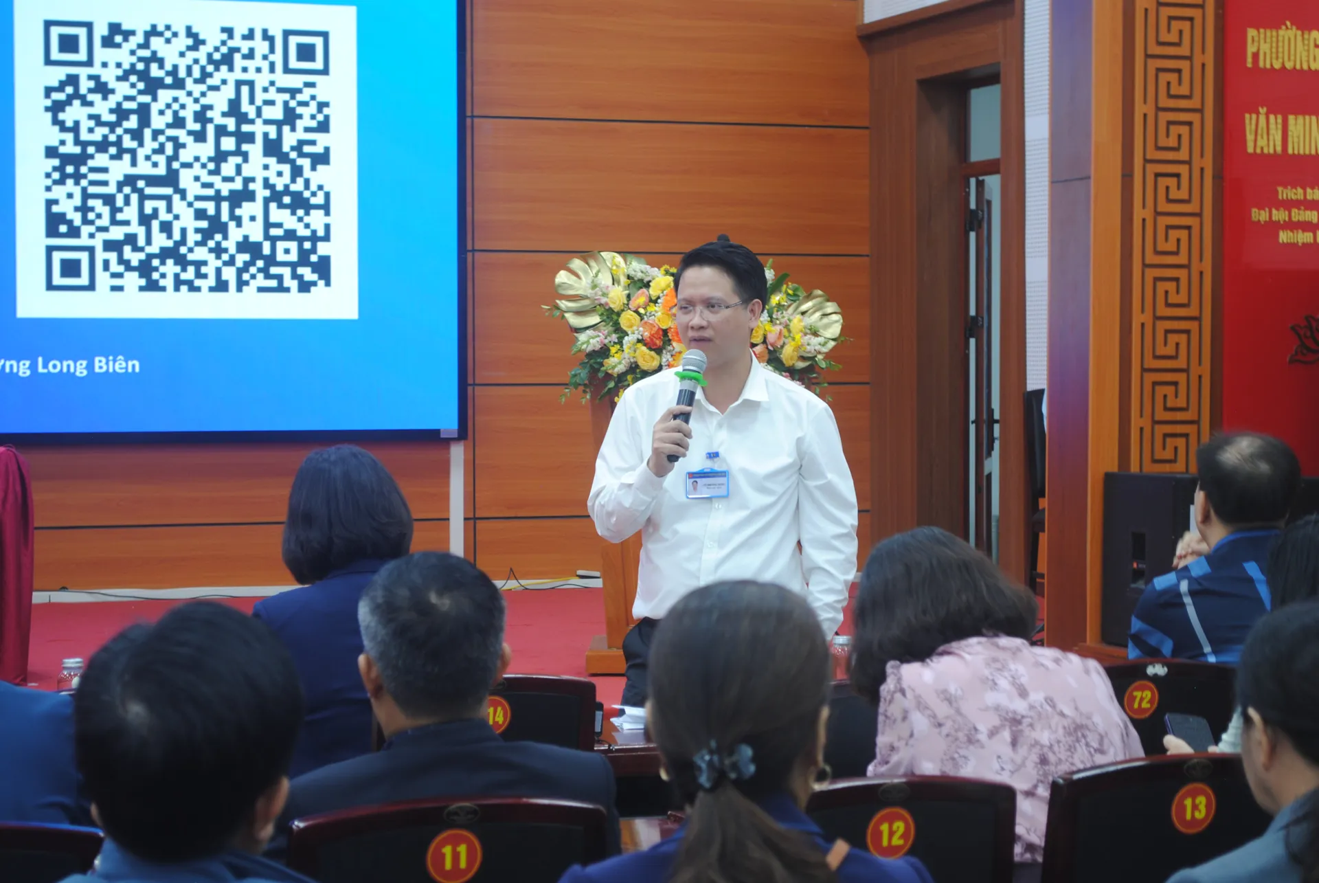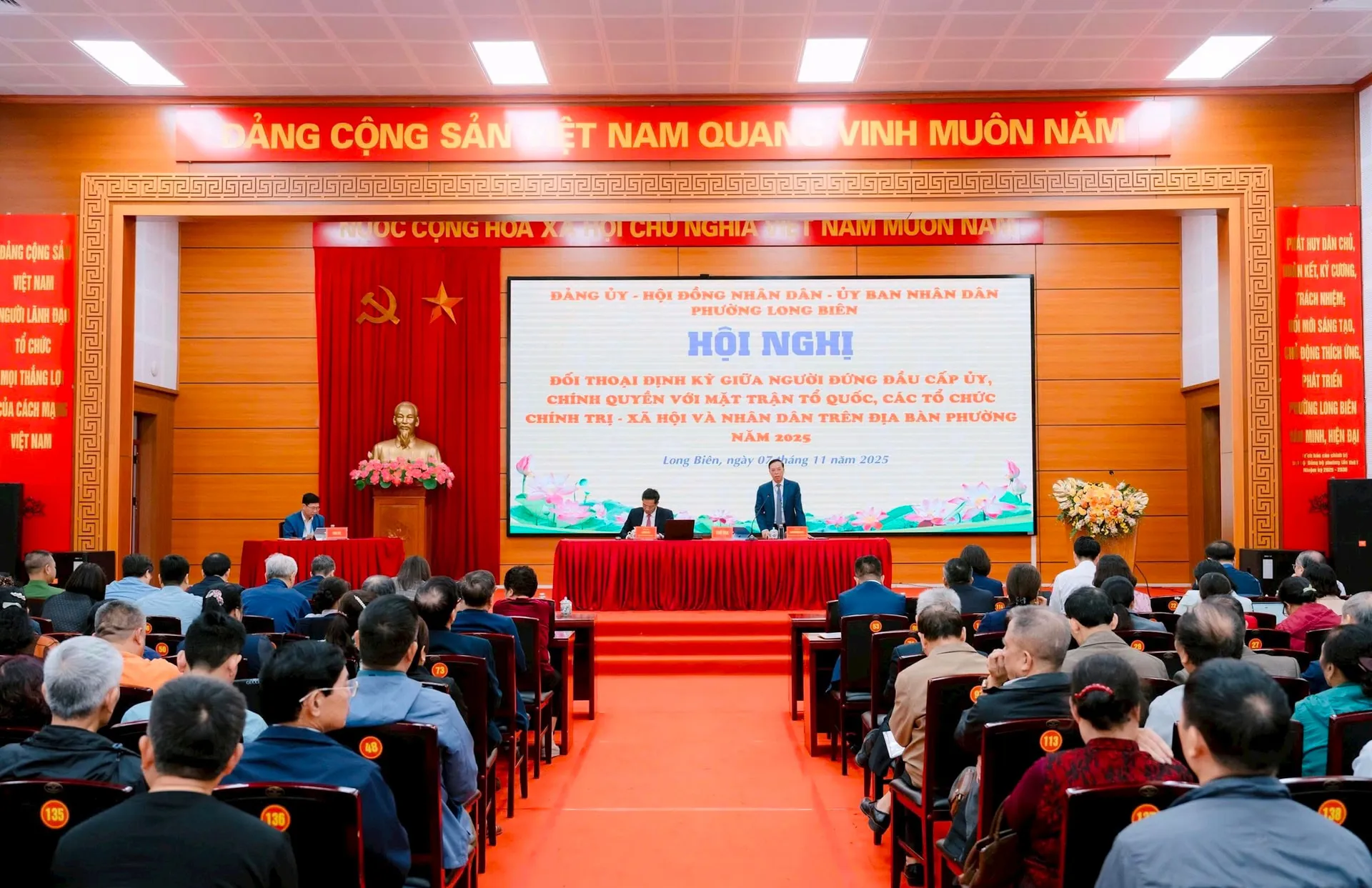 Quang cảnh Hội nghị đối thoại định kỳ giữa người đứng đầu cấp ủy, chính quyền với mặt trận Tổ quốc, các tổ chức chính trị - xã hội và Nhân dân trên địa bàn phường Long Biên năm 2025