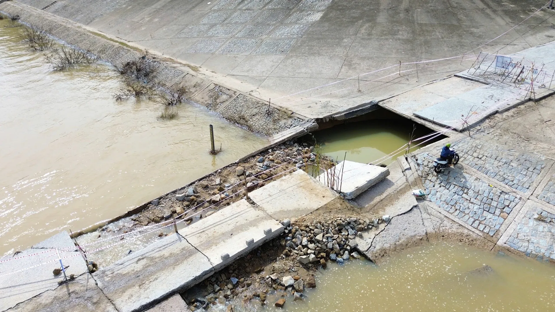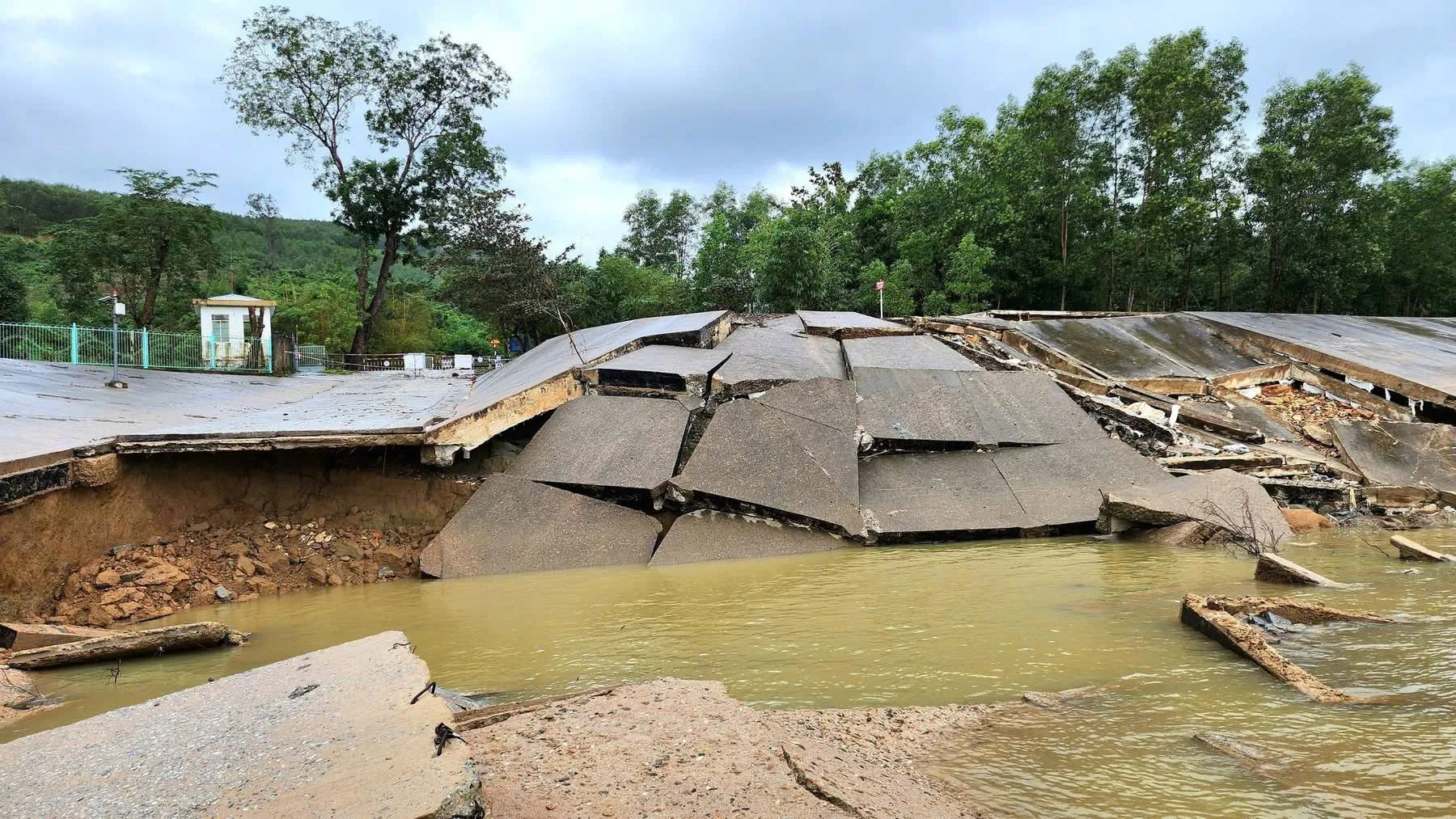 Theo ghi nhận, lũ đã cuốn trôi toàn bộ mố và nhịp cầu phía Tây, tạo ra khoảng đứt gãy dài 12m, rộng hơn 3,5m. Tại hiện trường, các mảng bê tông bị xé vụn, móng mố cầu bị xoáy sâu làm rỗng, taluy hai bên bị khoét hàm ếch, nền đường xói lở nghiêm trọng. Hệ thống kè bảo vệ cũng bị “đánh vỡ”, nhiều mảng bê tông mặt công trình bị cuốn phăng.