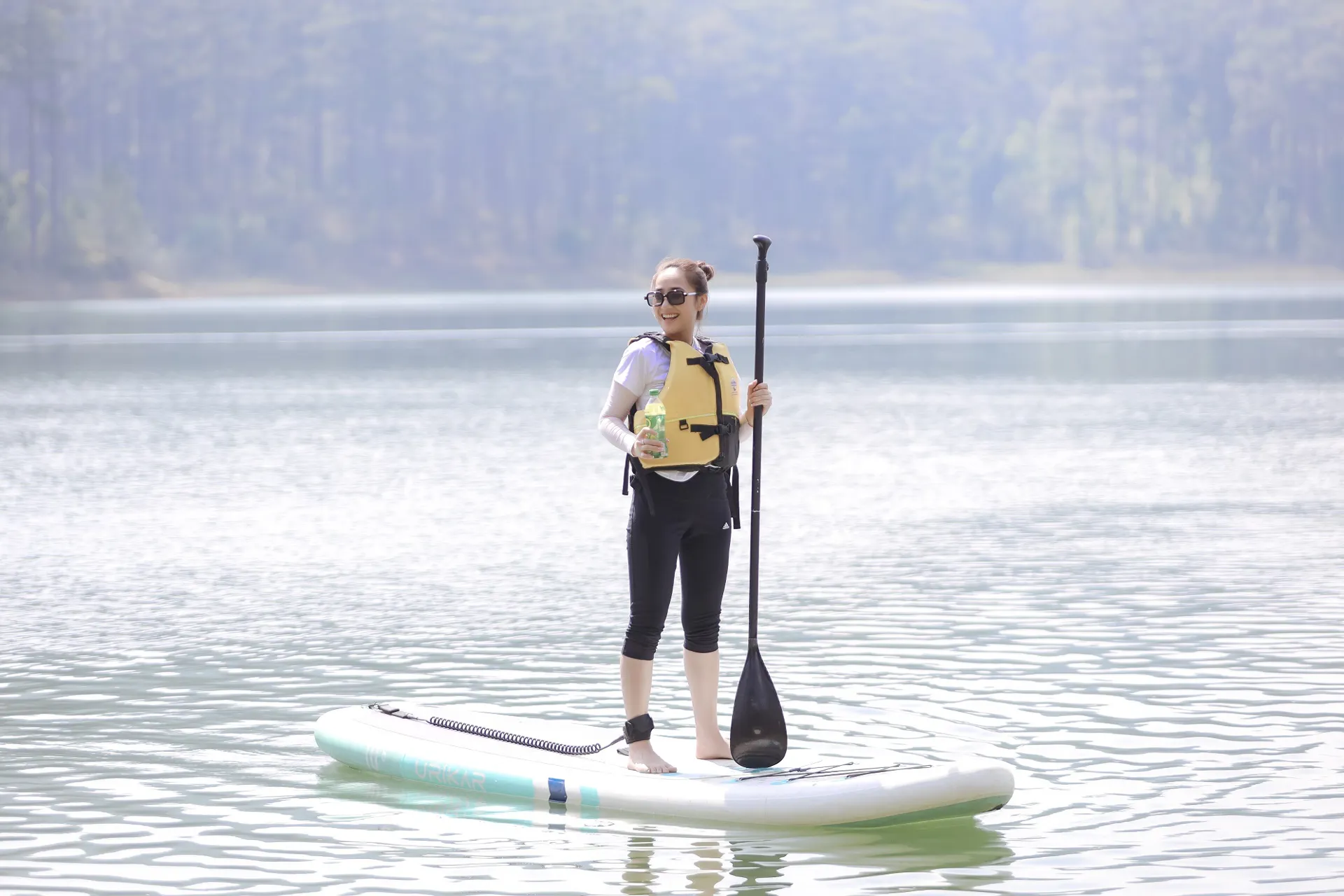 Trở về homestay, Phương Nghi cùng nhóm bạn ra hồ Tuyền Lâm chèo SUP. Mặt hồ phẳng lặng, sương tan dần, nhịp mái chiều đều đặn như xóa sạch mọi deadline. Khi khui những chai Trà Xanh Không Độ mát lạnh mang theo, vị trà xanh thiên nhiên nguyên chất lan tỏa như “công tắc reset” cuối cùng.