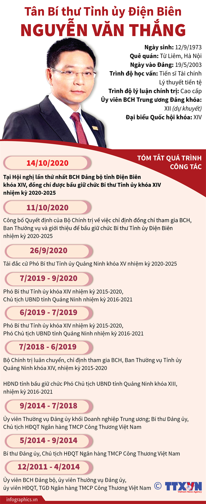 Ngày 14/10/2020, tại Hội nghị lần thứ nhất Ban chấp hành Đảng bộ tỉnh Điện Biên khóa XIV, đồng chí Nguyễn Văn Thắng được bầu giữ chức Bí thư Tỉnh ủy khóa XIV nhiệm kỳ 2020 - 2025.