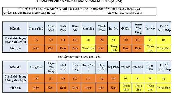 So với ngày hôm qua (14/3), chất lượng không khí tại Thủ đô có chiều hướng xấu đi, chỉ số AQI tăng. Các khu vực đa phần ở mức kém, nơi đo được AQI cao nhất là Hàng Đậu - 135, Phạm Văn Đồng - 131, Minh Khai - 128, Thành Công, Trung Yên 3, Hoàn Kiếm, Mỹ Đình chỉ số AQI dao động từ 108 đến 122. Các khu vực còn lại ở mức trung bình như Tân Mai, Tây Mỗ, Kim Liên, Đại sứ quán Pháp.
