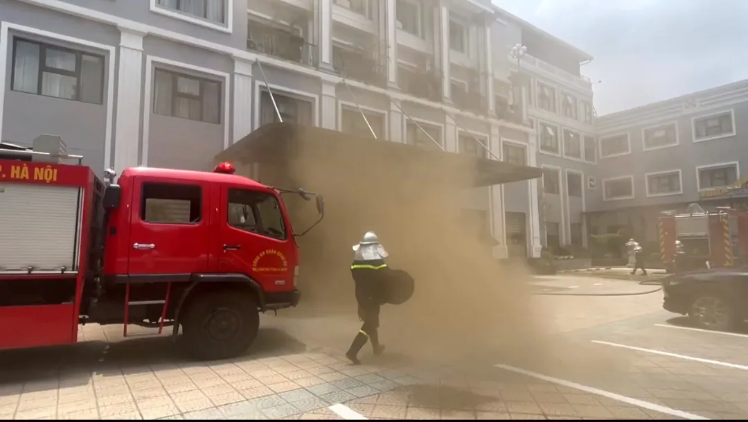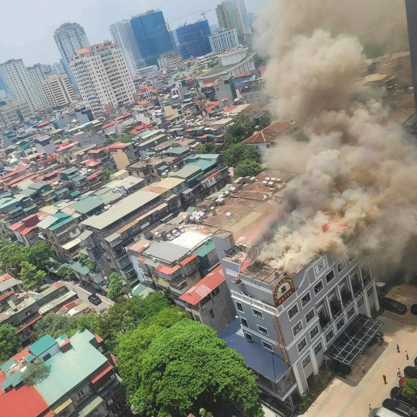 Kinhtedothi - Vụ cháy xảy ra vào thời điểm giữa trưa, khói bốc lên nghi ngút tại tầng thượng của khách sạn cao tầng trên phố Hoàng Ngọc Phách, Hà Nội. Các lực lượng chức năng nhanh chóng điều động xe chữa cháy cùng cán bộ chiến sỹ đến hiện trường.