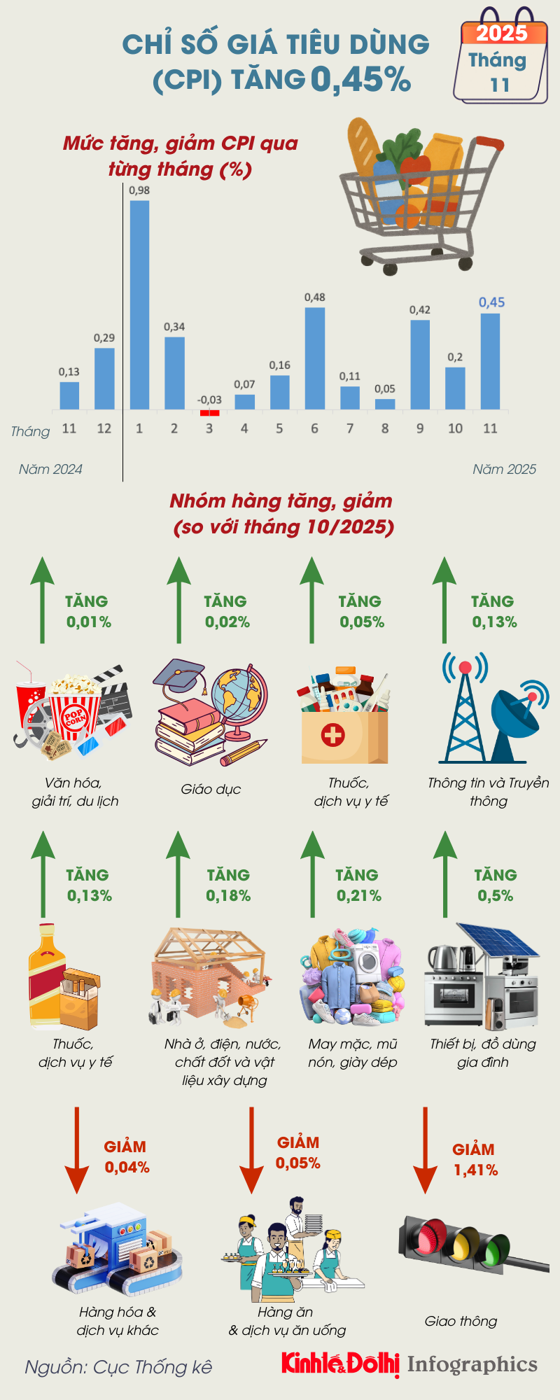 Chỉ số giá tiêu dùng tháng 11 năm 2025 tăng 0,45%