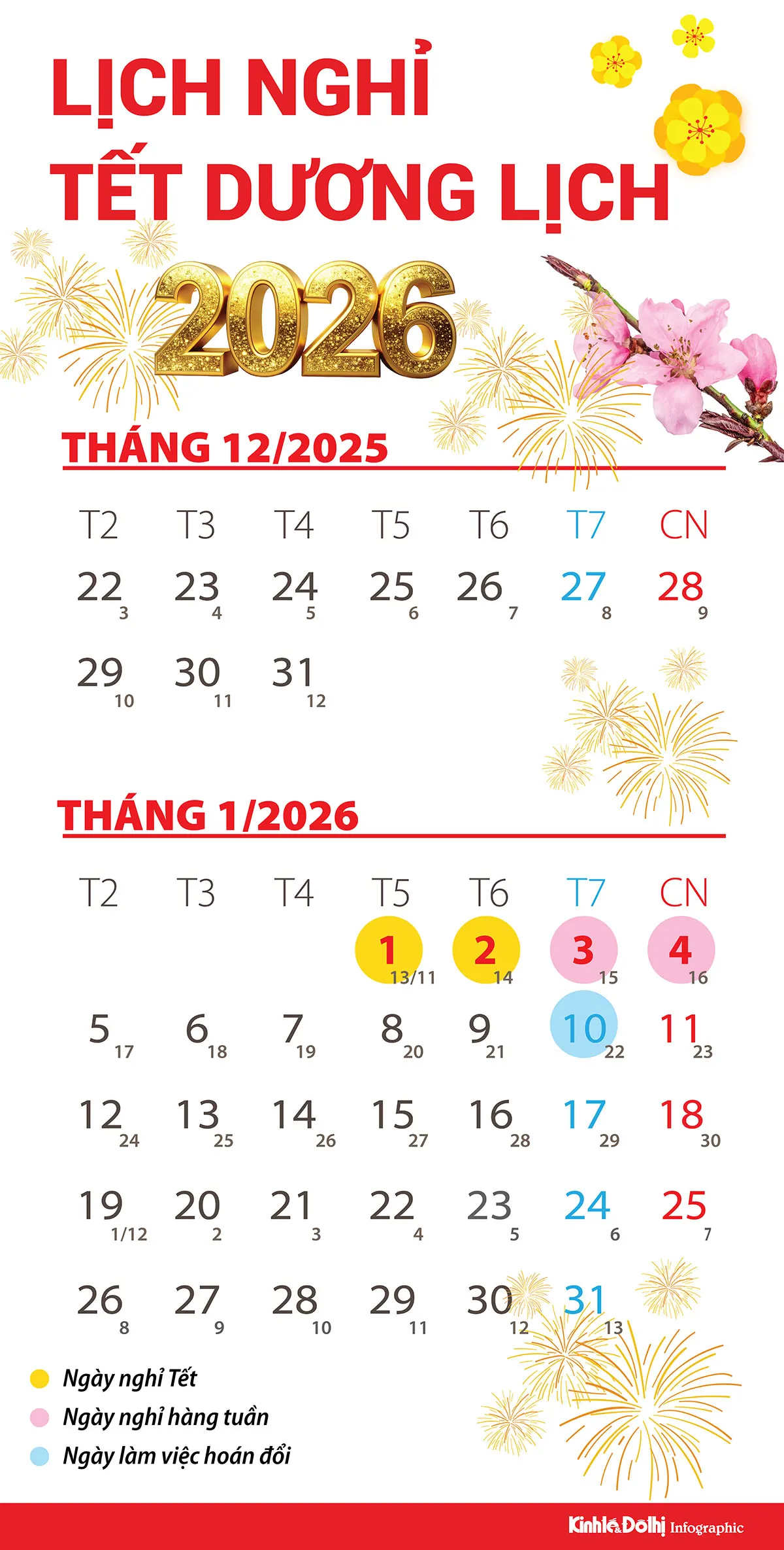 Kinhtedothi - Dịp nghỉ Tết Dương lịch năm 2026, công chức, viên chức được nghỉ 4 ngày liên tục từ thứ Năm ngày 1/1/2026 đến hết Chủ nhật ngày 4/1/2026 Dương lịch (làm bù vào thứ Bảy ngày 10/1/2026).
