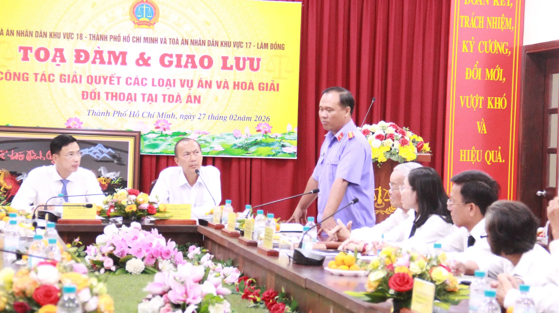 Phát biểu tại tọa đàm, ông Ngô Văn Minh, Chánh án TAND khu vực 18, cho biết đơn vị được hình thành trên cơ sở sáp nhập TAND TP Bến Cát và TAND huyện Dầu Tiếng (Bình Dương). Ngay sau sáp nhập, đơn vị đã nhanh chóng kiện toàn tổ chức, ổn định bộ máy, bảo đảm hoạt động xét xử diễn ra thông suốt, không để xảy ra ách tắc.