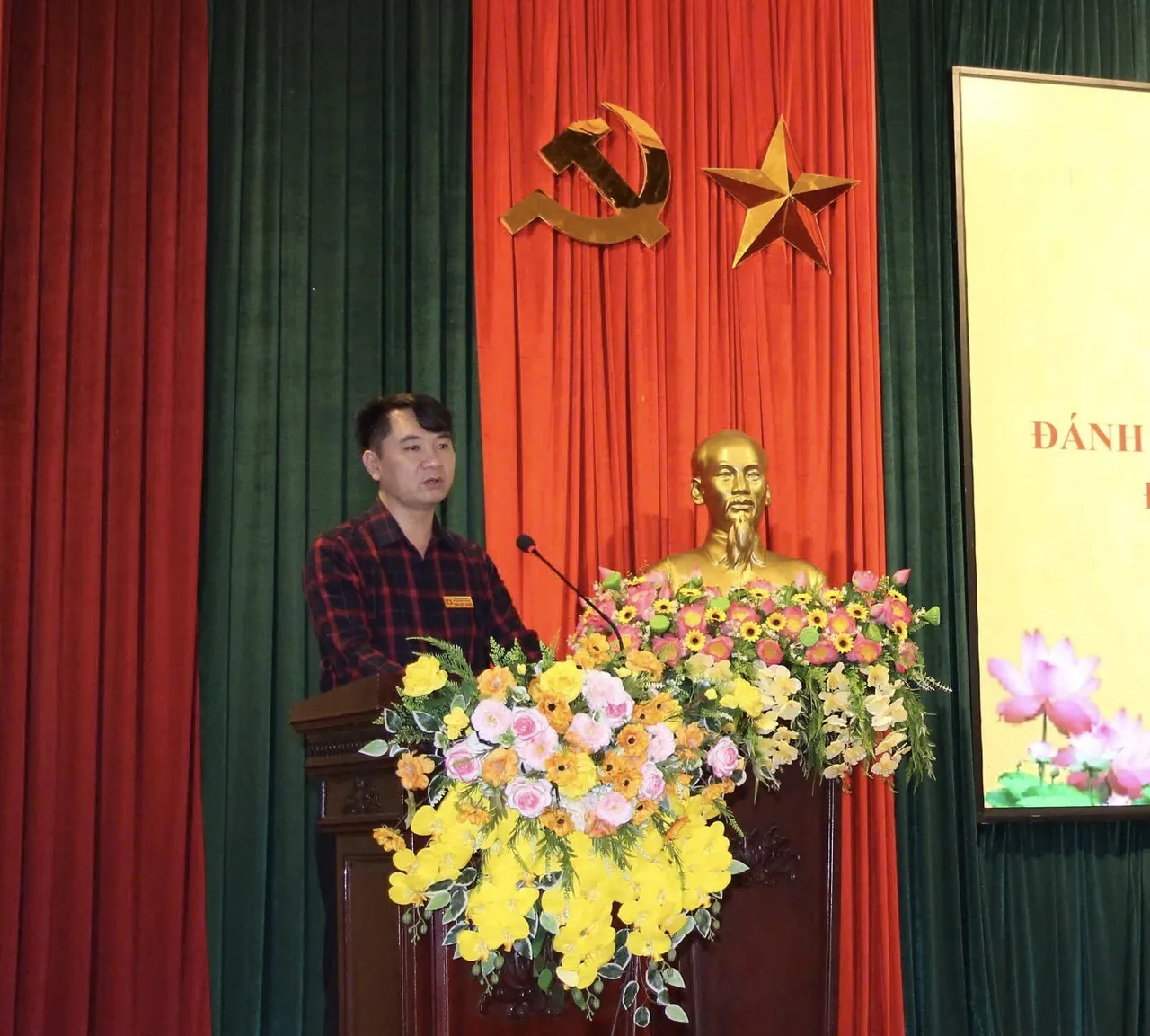 Đồng chí Trần Việt Thắng - Phó Bí thư Thường trực Đảng ủy xã Phúc Sơn trình bày Báo cáo công tác công tác xây dựng Đảng, xây dựng hệ thống chính trị tại Hội nghị.