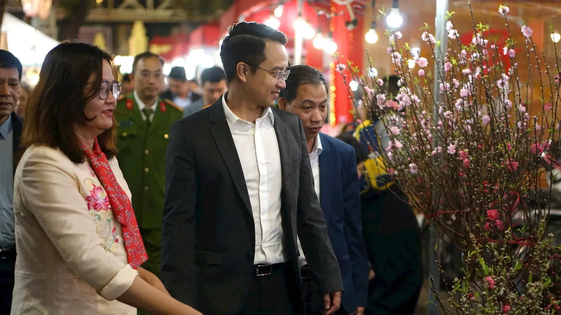 Lãnh đạo phường Hoàn Kiếm tham quan chợ hoa trong tối khai mạc. Ảnh: Trung Nguyên.