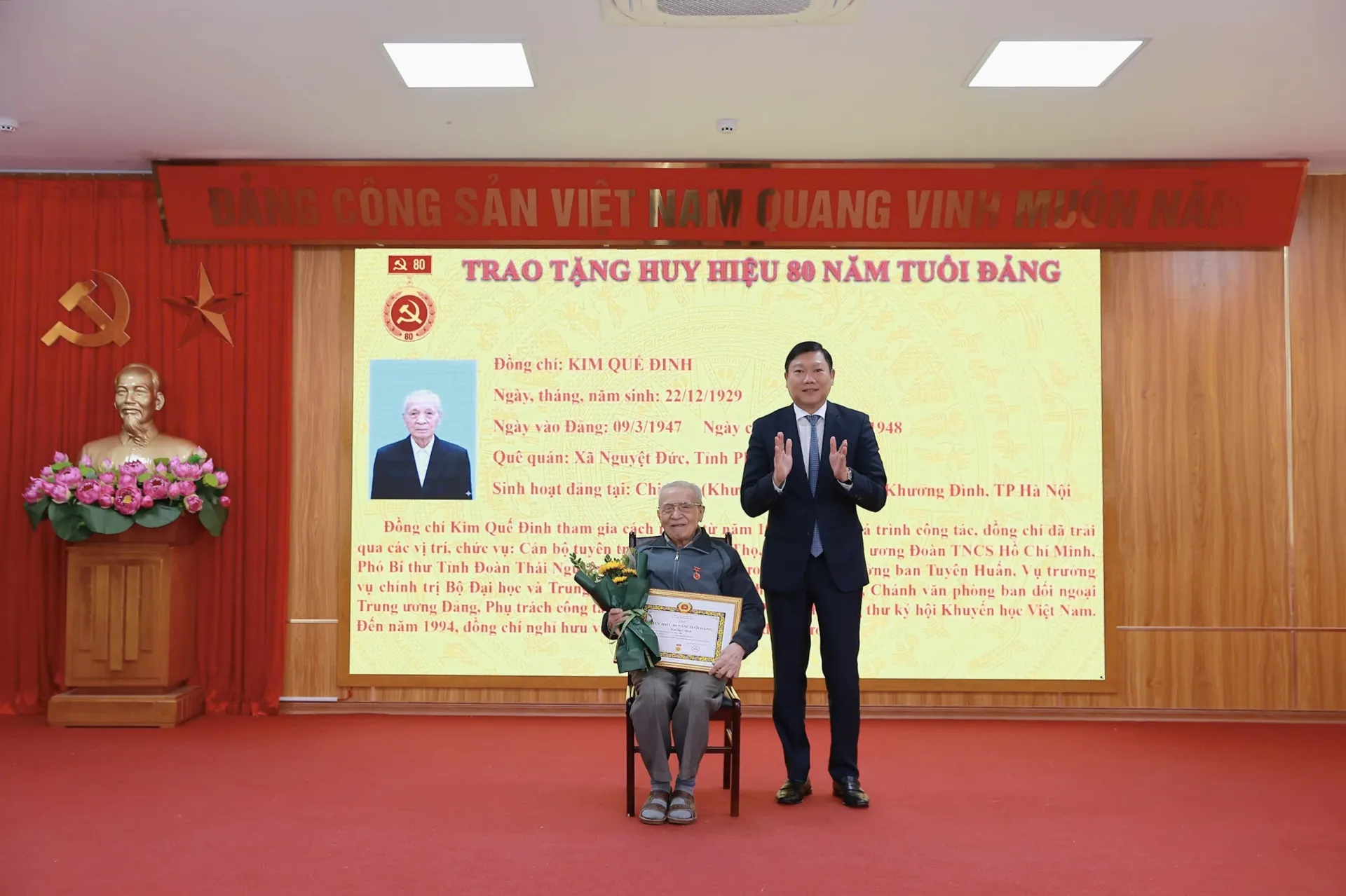 Đồng chí Kim Quế Đinh, sinh ngày 22/12/1929, quê quán xã Nguyệt Đức, tỉnh Phú Thọ, hiện sinh hoạt tại Chi bộ 8, phường Khương Đình, vinh dự nhận Huy hiệu 80 năm tuổi Đảng. Tham gia cách mạng từ năm 1945, trong suốt quá trình công tác, đồng chí từng đảm nhiệm nhiều cương vị quan trọng như: Vụ trưởng Vụ Chính trị Bộ Đại học và Trung học chuyên nghiệp, Bí thư Đảng ủy Bộ; Chánh Văn phòng Ban Đối ngoại Trung ương Đảng; phụ trách công tác đối ngoại Tây Âu tại Pháp; Phó Tổng Thư ký Hội Khuyến học Việt Nam. Năm 1994, đồng chí nghỉ hưu và tiếp tục tham gia sinh hoạt, đóng góp tại địa phương. Với những cống hiến cho sự nghiệp cách mạng, đồng chí được trao tặng nhiều huân chương, huy chương cao quý của Đảng và Nhà nước.