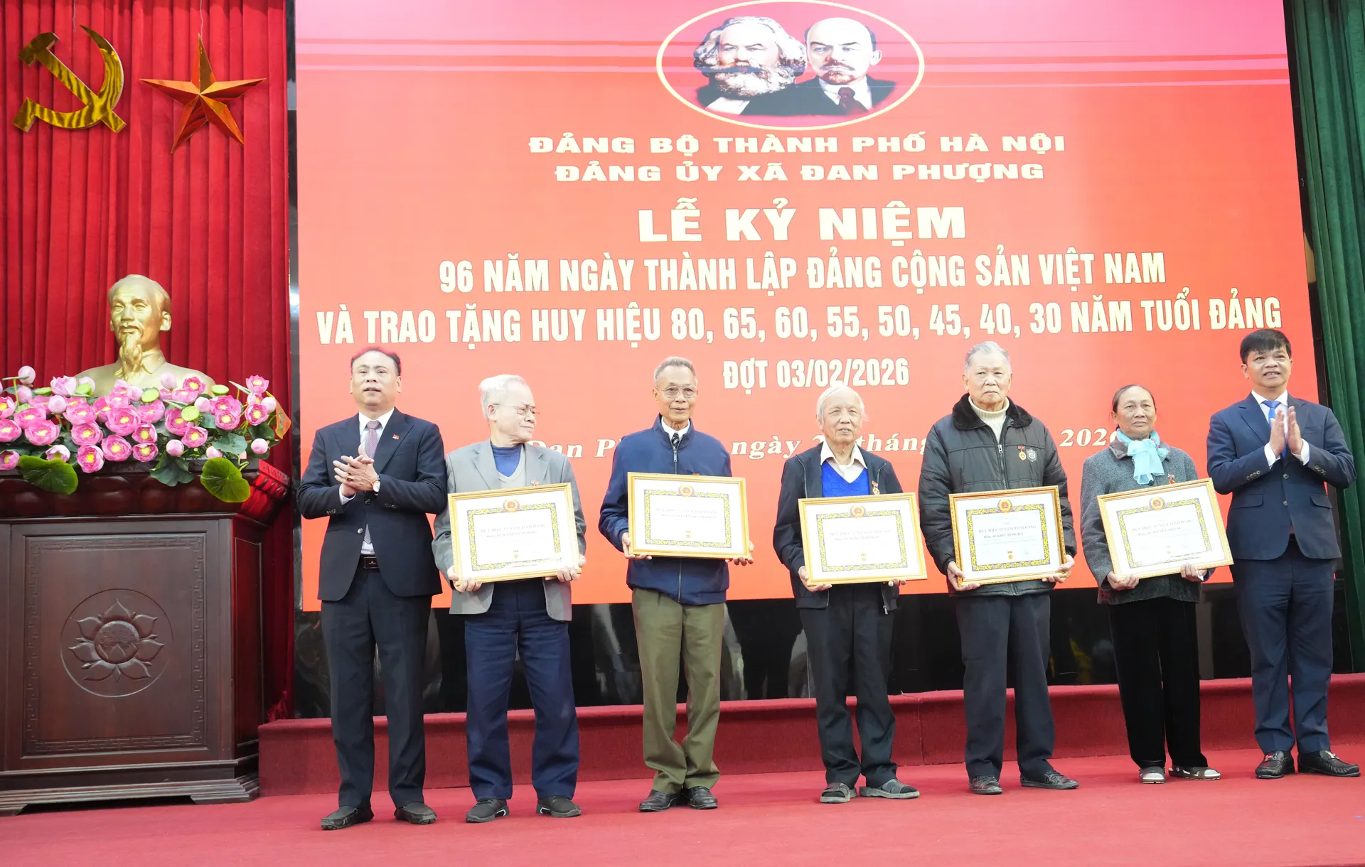 Tại buổi lễ, Đảng ủy xã Đan Phượng đã tiến hành trao tặng Huy hiệu 80, 65, 60, 50, 45, 40, 30 năm tuổi Đảng, đợt 3/2/2026 cho các đảng viên. Trong dịp này, Đảng bộ xã Đan Phượng có 51 đảng viên được trao Huy hiệu Đảng, trong đó có 1 đảng viên được trao tặng Huy hiệu 80 năm tuổi Đảng (đảng viên Nguyễn Thị Hoàn sinh ngày 13/3/1926, hiện đang sinh hoạt tại Chi bộ phố Phùng Hưng - xã Đan Phượng); 1 đảng viên nhân Huy hiệu 65 năm tuổi Đảng; 5 đảng viên nhận Huy hiệu 60 năm tuổi Đảng; 6 đảng viên nhận Huy hiệu 55 năm tuổi Đảng; 1 đảng viên nhận Huy hiệu 50 năm tuổi Đảng; 13 đảng viên nhận Huy hiệu 45 năm tuổi Đảng; 11 đảng viên nhận Huy hiệu 40 năm tuổi Đảng và 14 đảng viên nhận Huy hiệu 30 năm tuổi Đảng.