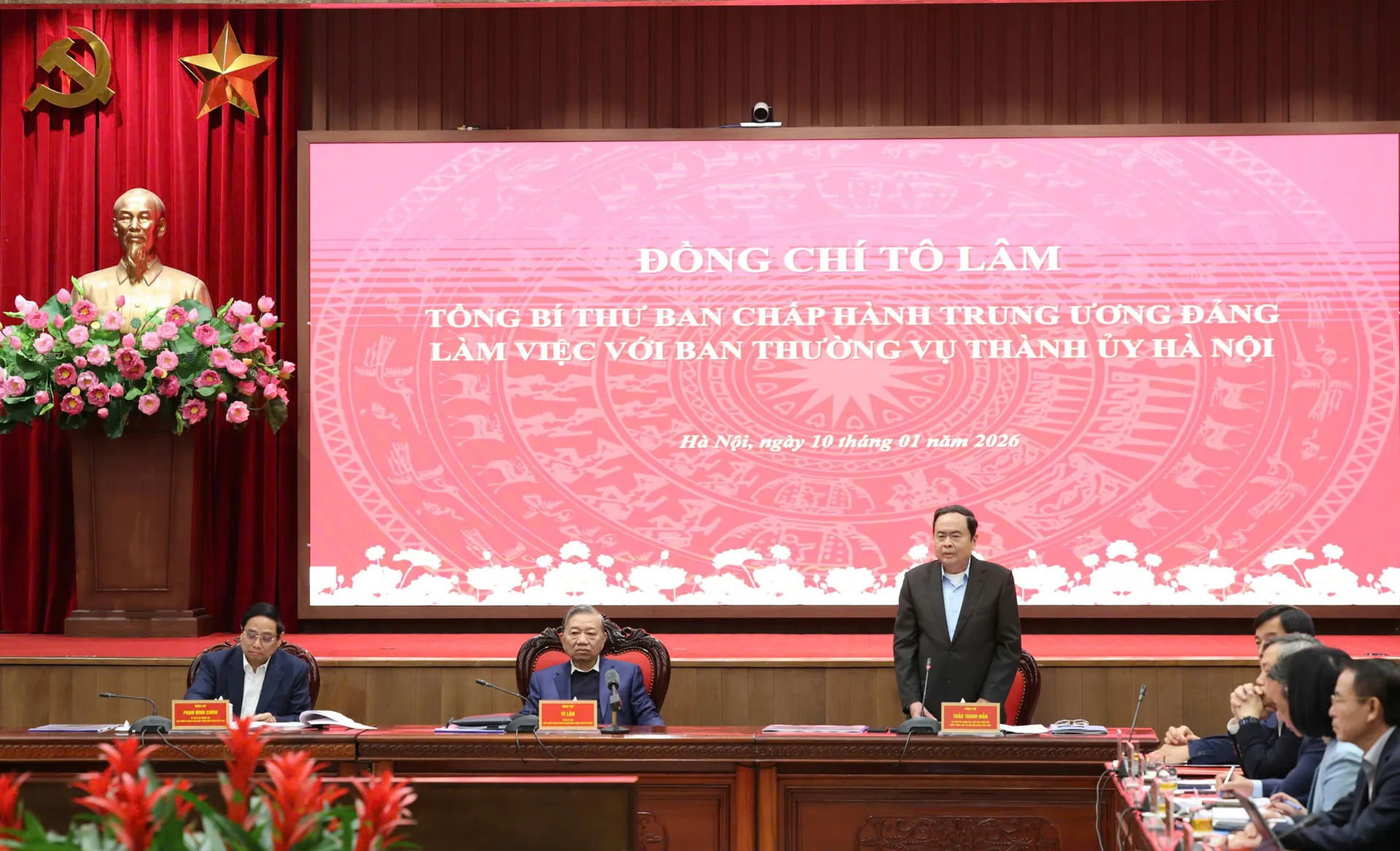 Sáng 10/1, Tổng Bí thư Tô Lâm và các đồng chí Ủy viên Bộ Chính trị: Thủ tướng Chính phủ Phạm Minh Chính, Chủ tịch Quốc hội Trần Thanh Mẫn đã làm việc với Ban Thường vụ Thành ủy Hà Nội về đề xuất xây dựng Quy hoạch tổng thể Thủ đô tầm nhìn 100 năm gắn với hoàn thiện thể chế đáp ứng yêu cầu phát triển, dự kiến mô hình phát triển kinh tế - xã hội và thực hiện mục tiêu tăng trưởng 2 con số.