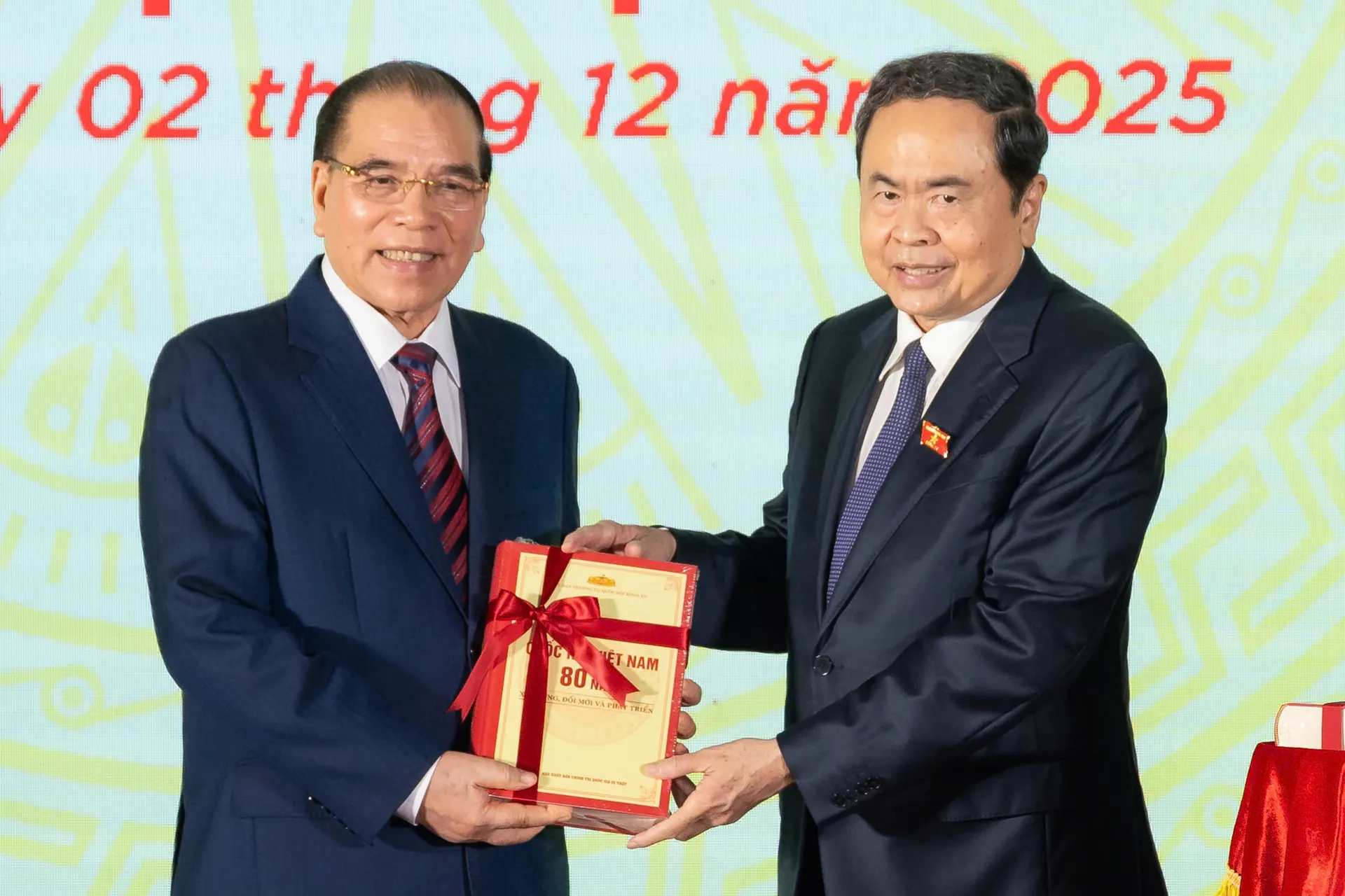 Chủ tịch Quốc hội Trần Thanh Mẫn; nguyên Tổng Bí thư, nguyên Chủ tịch Quốc hội Nông Đức Mạnh và các đồng chí lãnh đạo dự Lễ khai trương Bảo tàng Quốc hội Việt Nam và Lễ công bố các bộ sách, ấn phẩm và phát hành bộ tem bưu chính Kỷ niệm 80 năm Quốc hội Việt Nam