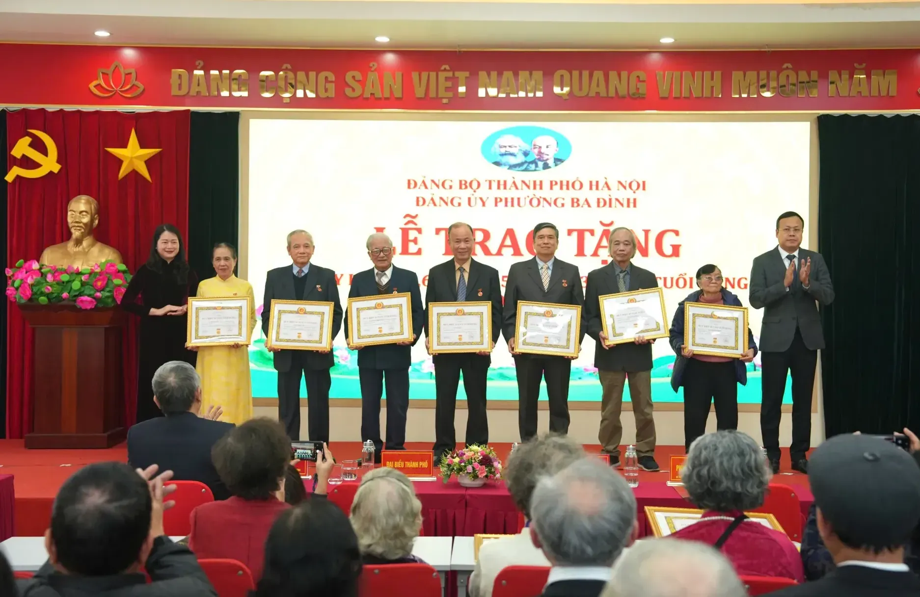 Phó Bí thư Thành ủy, Chủ tịch UBND thành phố Hà Nội Vũ Đại Thắng và Bí thư Đảng ủy, Chủ tịch HĐND phường Ba Đình Phạm Quang Thanh chúc mừng đảng viên Ngô Huy Phát nhận Huy hiệu 80 năm tuổi Đảng.