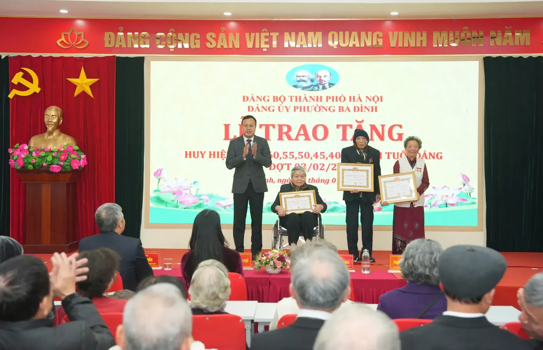 Đợt trao huy hiệu Đảng 3/2 năm nay, Đảng bộ phường Ba Đình có 102 đảng viên được trao tặng, truy tặng Huy hiệu Đảng, trong đó có 2 đồng chí nhận Huy hiệu 80 năm tuổi Đảng.