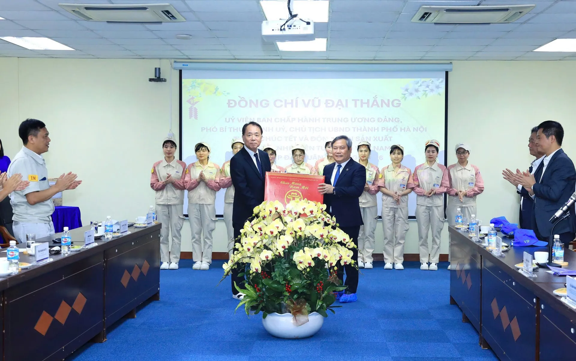 Chủ tịch UBND TP Hà Nội Vũ Đại Thắng bày tỏ vui mừng khi đến thăm doanh nghiệp đầu tư nước ngoài đã có gần 20 năm hoạt động tại Hà Nội và có nhiều đóng góp quan trọng cho ngành công nghiệp điện tử, đặc biệt trong lĩnh vực sản xuất và xuất khẩu.