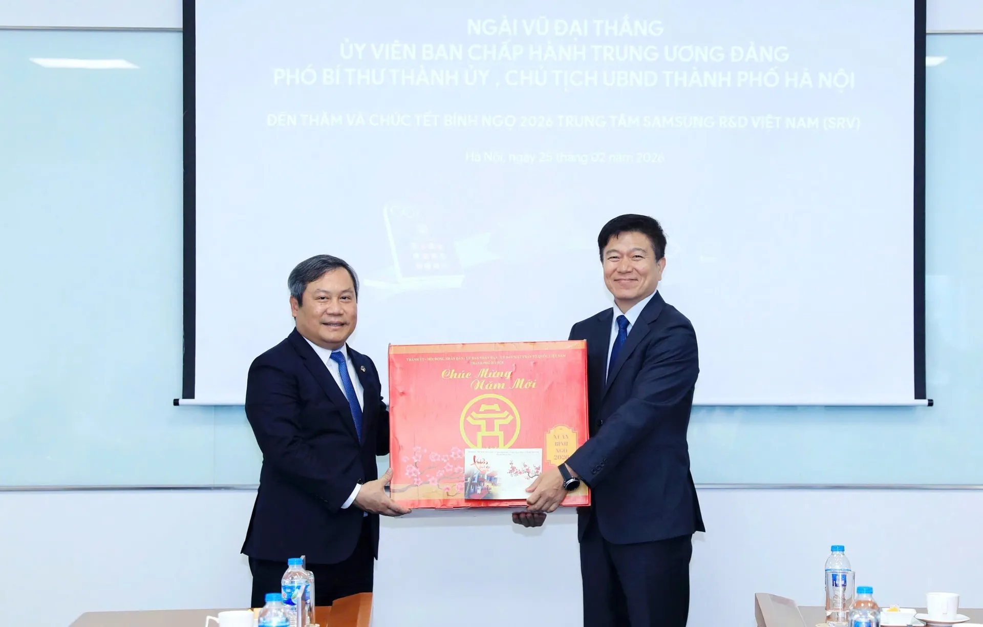 Chủ tịch UBND TP Vũ Đại Thắng cùng Đoàn công tác đến thăm, chúc Tết, động viên cán bộ và nhân viên tại Trung tâm Nghiên cứu và Phát triển Samsung Việt Nam (Lô B1-CC3, Khu đô thị Tây Hồ Tây, phường Xuân Đỉnh)