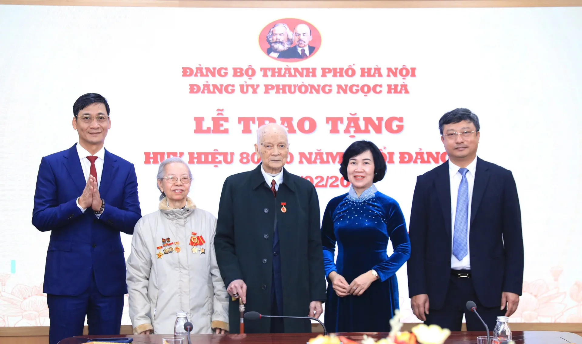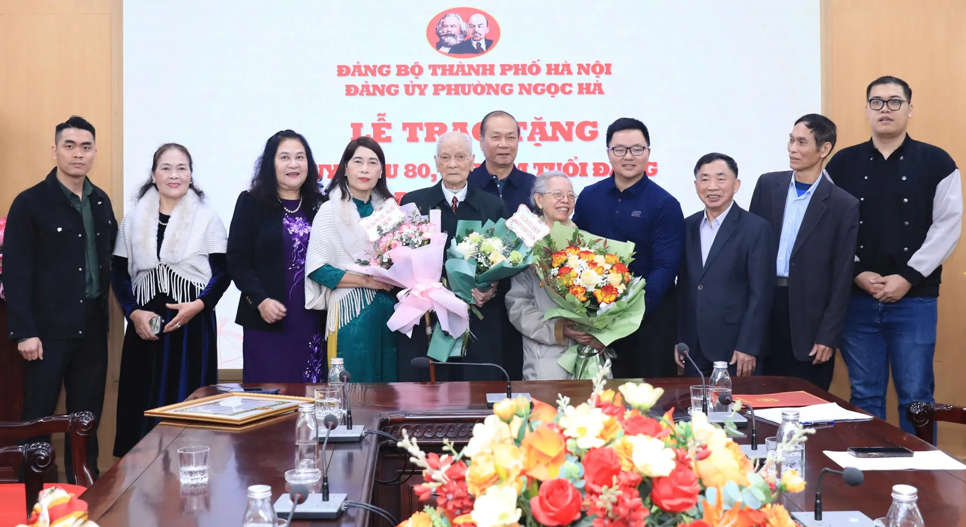 Phó Bí thư Thành ủy, Chủ tịch UBND TP Hà Nội Vũ Đại Thắng và Bí thư Đảng ủy, Chủ tịch HĐND phường Ngọc Hà Lê Thanh Nam chúc mừng các đảng viên nhận Huy hiệu 80, 70 năm tuổi Đảng.