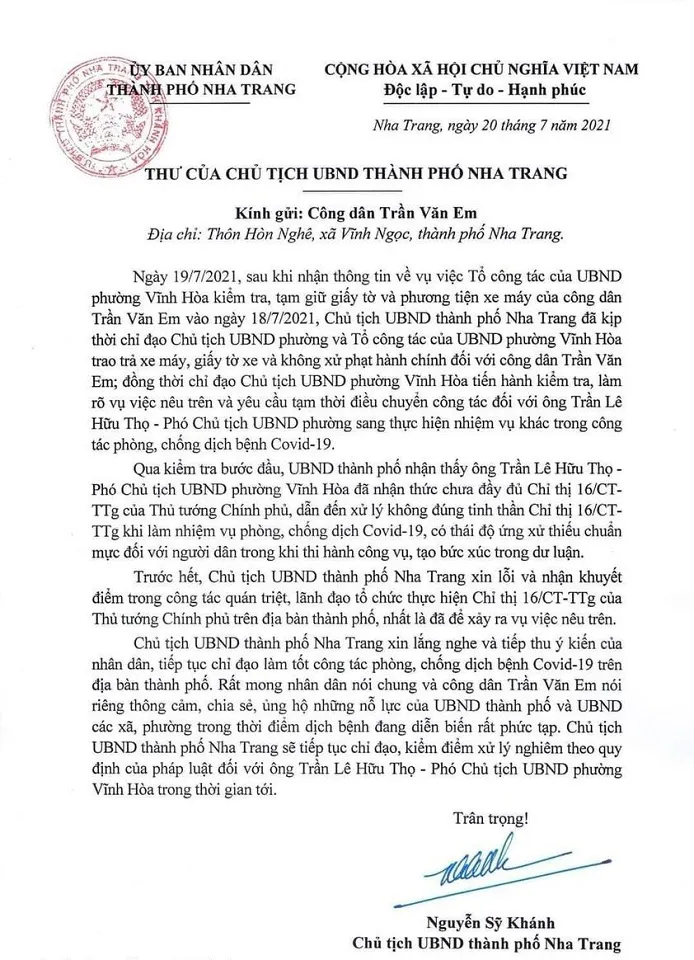 Thư do ông Nguyễn Sỹ Khánh - Chủ tịch UBND TP Nha Trang có nêu: “Ngày 19/7, sau khi nhận thông tin về vụ việc tổ công tác của UBND phường Vĩnh Hòa kiểm tra, tạm giữ giấy tờ và phương tiện xe máy của công dân Trần Văn Em vào ngày 18/7, Chủ tịch UBND TP Nha Trang đã kịp thời chỉ đạo Chủ tịch và tổ công tác của UBND phường Vĩnh Hòa trao trả xe máy, giấy tờ xe và không xử phạt hành chính đối với công dân Trần Văn Em; Đồng thời chỉ đạo Chủ tịch UBND phường Vĩnh Hòa tiến hành kiểm tra, làm rõ vụ việc nêu trên và yêu cầu tạm thời điều chuyển công tác đối với ông Trần Lê Hữu Thọ - Phó Chủ tịch UBND phường sang thực hiện nhiệm vụ khác trong công tác phòng, chống dịch bệnh Covid-19.