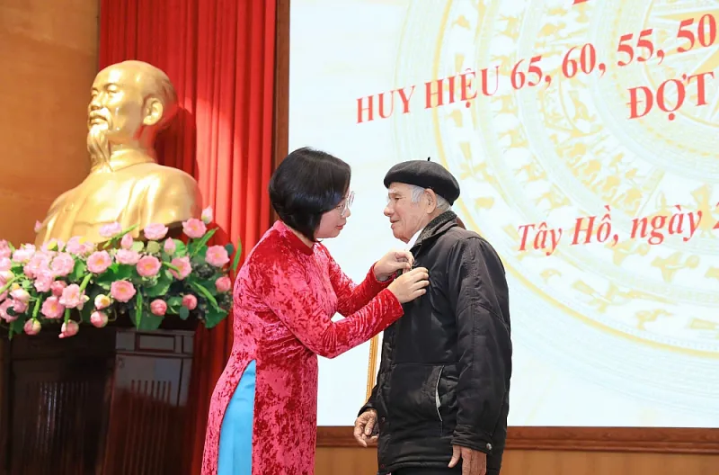 Đồng chí cũng thông tin, đợt 3/2/2026, toàn TP Hà Nội có 8.113 đảng viên được nhận Huy hiệu Đảng, trong đó Đảng bộ phường Tây Hồ có 141 đồng chí, nổi bật có 1 đồng chí được nhận Huy hiệu 80 năm tuổi Đảng và 1 đồng chí được nhận Huy hiệu 70 năm tuổi Đảng.