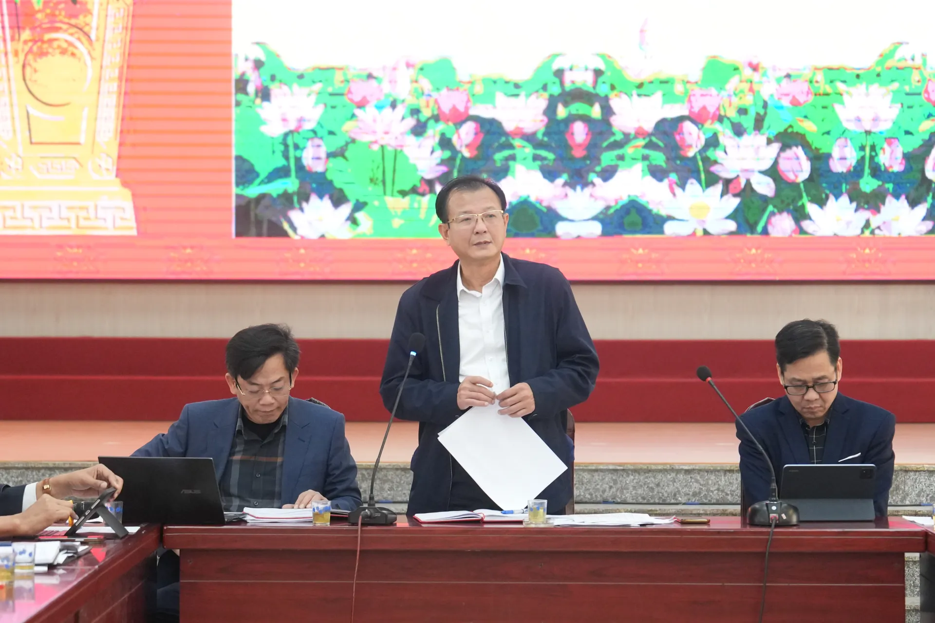 Bí thư Đảng ủy, Chủ tịch HĐND xã Ứng Thiên Nguyễn Chí Viễn phát biểu chỉ đạo hội nghị. Ảnh: Lại Tấn