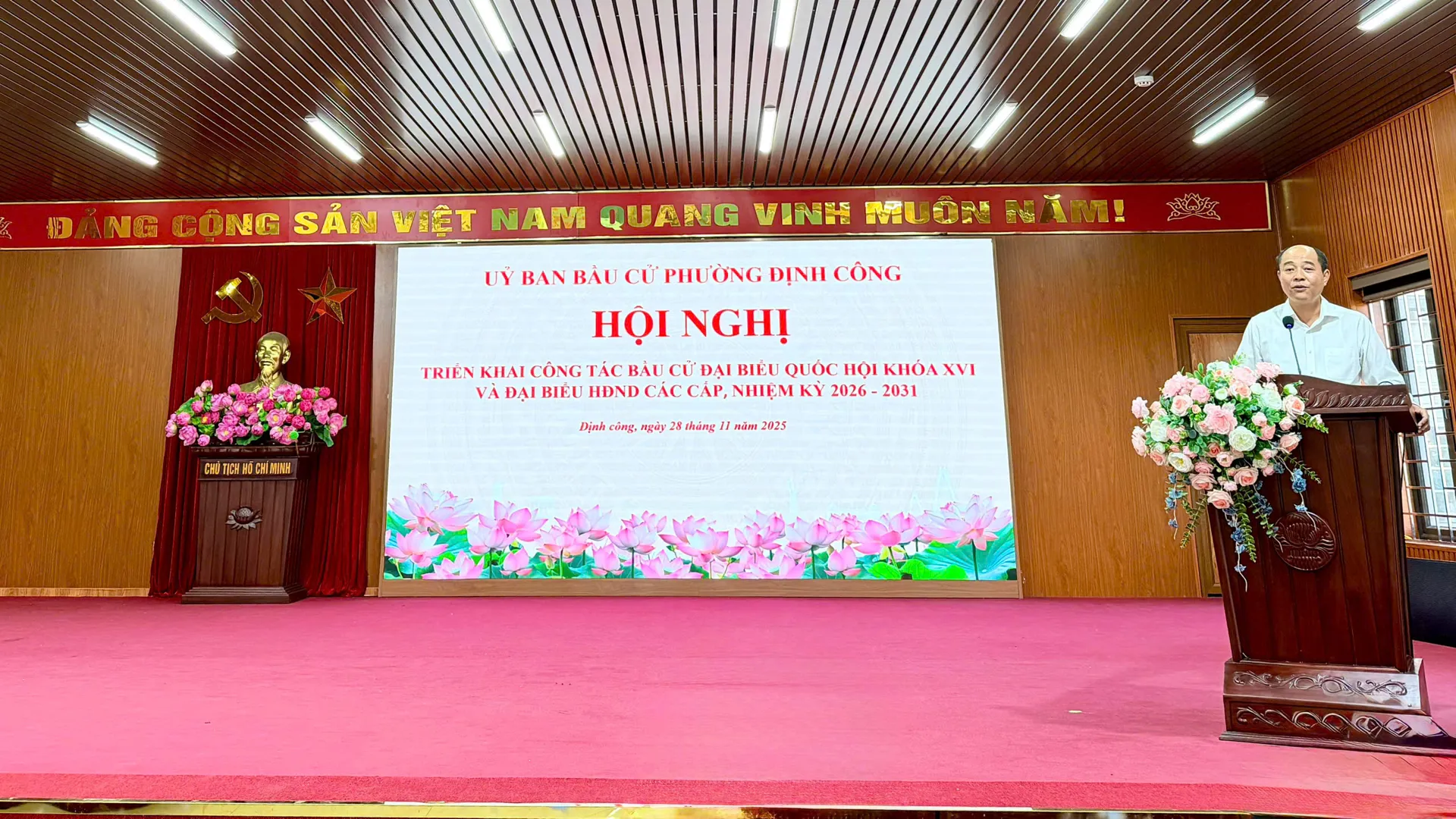 Kinhtedothi-Ngày 28/11, phường Định Công tổ chức hội nghị triển khai công tác bầu cử, quán triệt chỉ đạo, tuyên truyền sâu rộng đến rà soát danh sách cử tri, bảo đảm an ninh trật tự. Với sự vào cuộc đồng bộ, cuộc bầu cử hứa hẹn sẽ diễn ra dân chủ, đúng pháp luật, thực sự là ngày hội toàn dân.