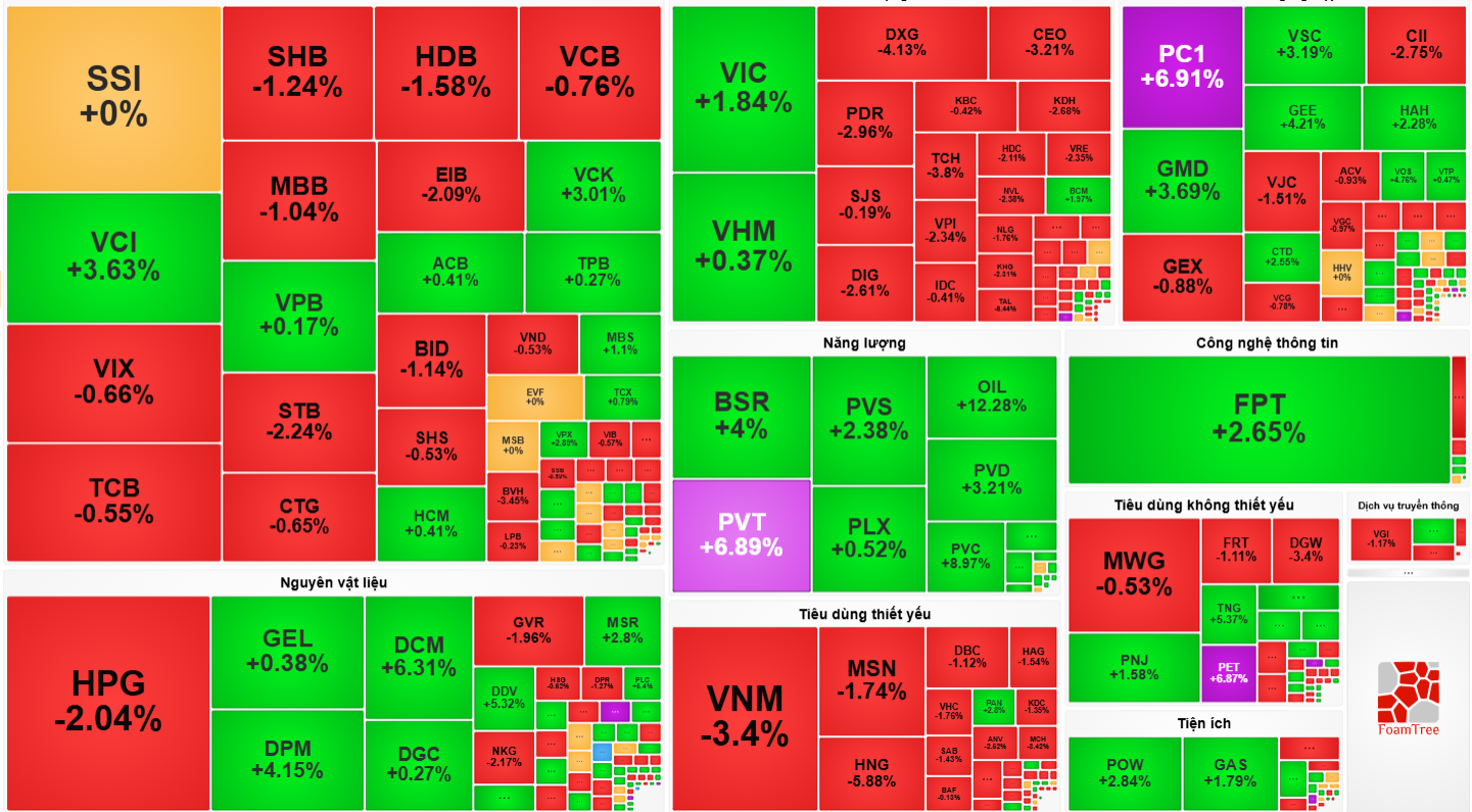 Trong nhóm công nghiệp, PC1 tăng 6,91%, VSC tăng 3,19%, GMD tăng 3,69%, GEE tăng 4,21% và HAH tăng 2,28%. Ở chiều giảm, CII mất 2,75%, VJC giảm 1,51%, GEX lùi 0,88%.