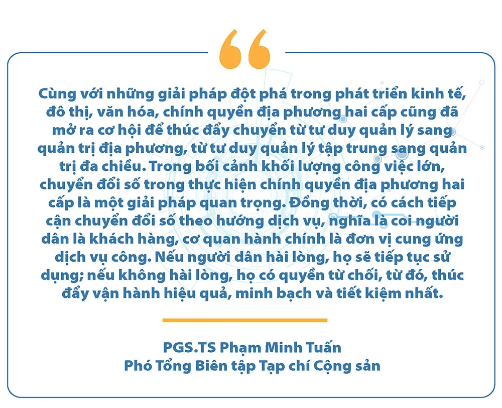 Từ góc nhìn chuyên gia, yếu tố then chốt của chuyển đổi số trong mô hình chính quyền địa phương hai cấp còn nằm ở khả năng hình thành một dòng chảy dữ liệu thống nhất trong toàn hệ thống chính trị. Dữ liệu từ cơ sở phải trở thành dữ liệu của tỉnh; dữ liệu của tỉnh phải kết nối được với Trung ương và toàn bộ quy trình đó phải diễn ra tự động. Khi luồng dữ liệu thông suốt, việc điều hành trở nên chính xác, việc phục vụ người dân trở nên thuận tiện, còn việc giám sát trở nên hiệu quả. Chuyển đổi số vì thế không chỉ tạo ra công cụ hỗ trợ, mà tái định hình phương thức quản lý một cách căn bản.