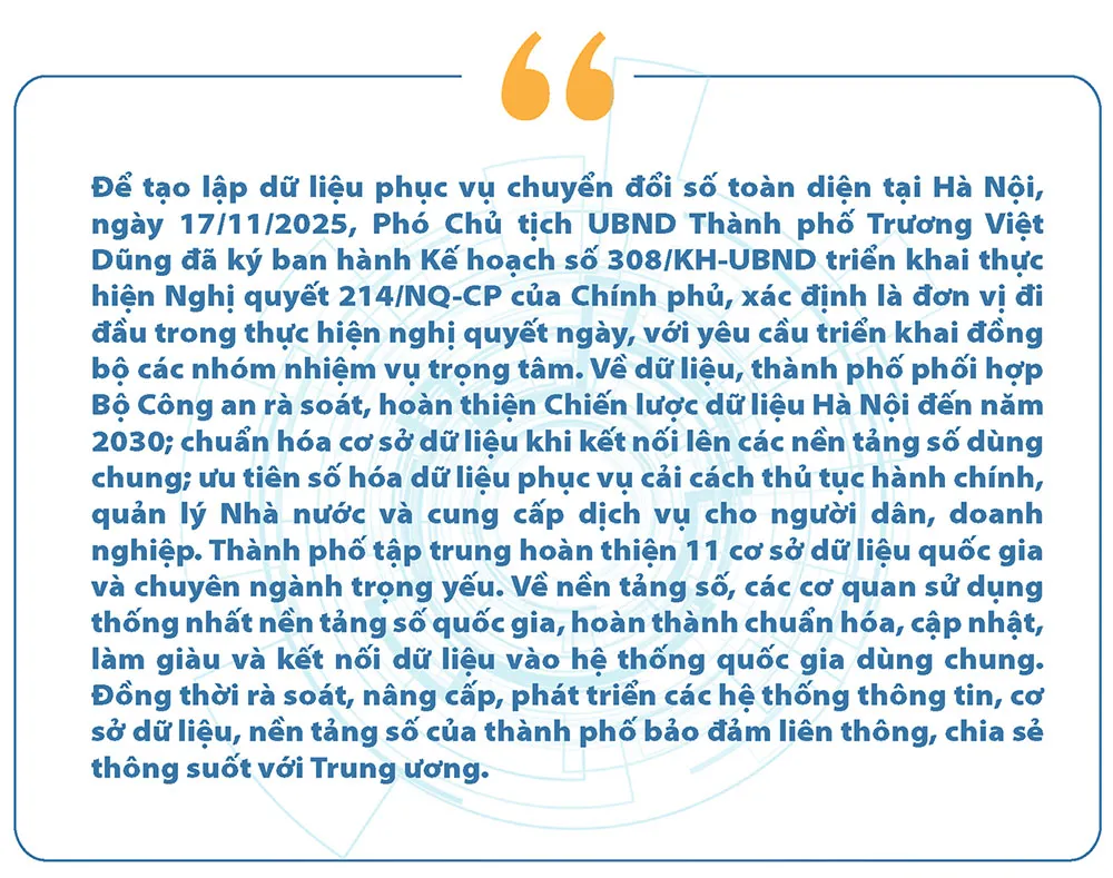 Với quyết tâm xây dựng mô hình giao dịch hành chính hiện đại, Hà Nội và các phường trên địa bàn cũng đã bước đầu triển khai nhiều giải pháp nhằm thống kê, tổng hợp, quản lý dữ liệu một cách chính xác, đồng bộ đồng thời đảm bảo an toàn và quyền riêng tư cho người dân. Hà Nội thúc đẩy mạnh mẽ xây dựng cơ sở dữ liệu. Thành phố triển khai 62 cơ sở dữ liệu chuyên ngành, kết nối với 28 hệ thống quốc gia qua nền tảng chia sẻ dữ liệu. Hạ tầng mạng chuyên dùng tới các xã, phường được hoàn thiện, tạo điều kiện để chính quyền địa phương hai cấp vận hành thống nhất, xử lý hồ sơ nhanh hơn và chia sẻ dữ liệu thông suốt.