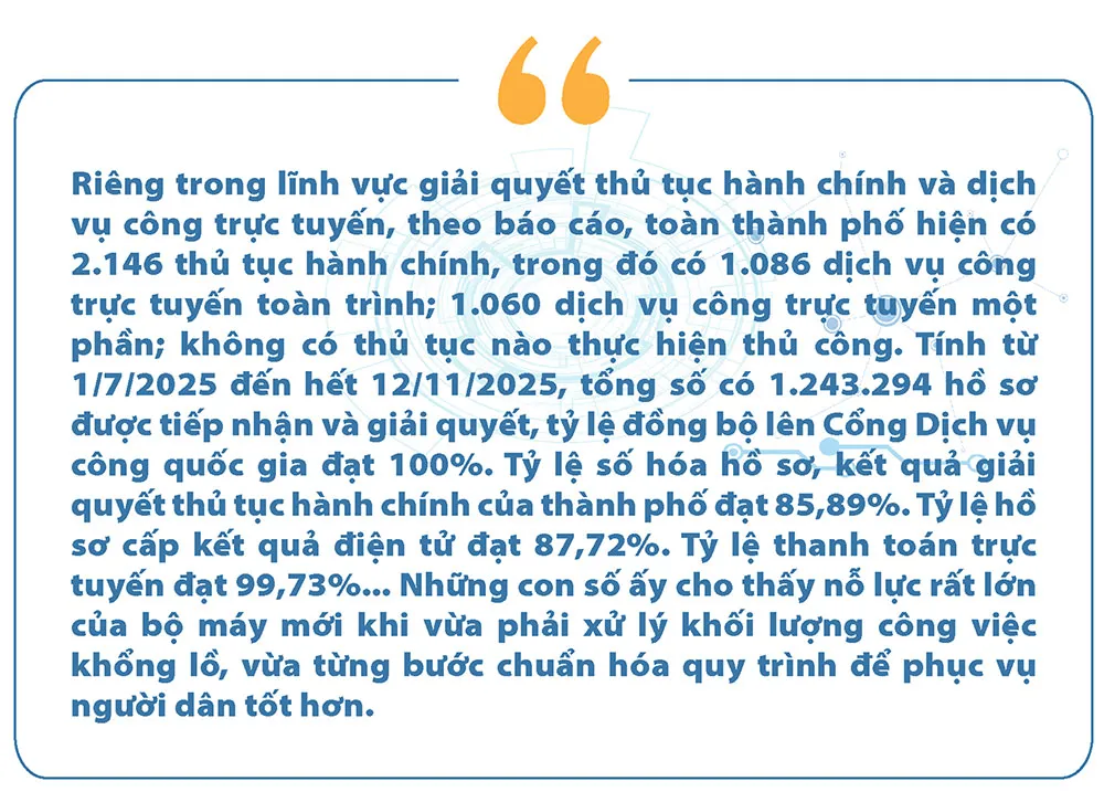 Thành phố cũng đưa triết lý "Đồng bộ - Dữ liệu - Chủ động" trở thành kim chỉ nam cho quá trình triển khai. Đồng bộ thể hiện ở việc các chủ trương, chính sách được quán triệt thống nhất từ cấp ủy đến chính quyền và từng cán bộ cơ sở. Dữ liệu được coi là yếu tố nền tảng, là "nguyên liệu" để ra các quyết định chính xác, kịp thời và theo thời gian thực. Trong khi đó, chủ động chính là thái độ làm việc không thụ động chờ đủ hướng dẫn, mà vừa triển khai vừa hoàn thiện, bảo đảm đáp ứng nhanh với thực tiễn vận hành.