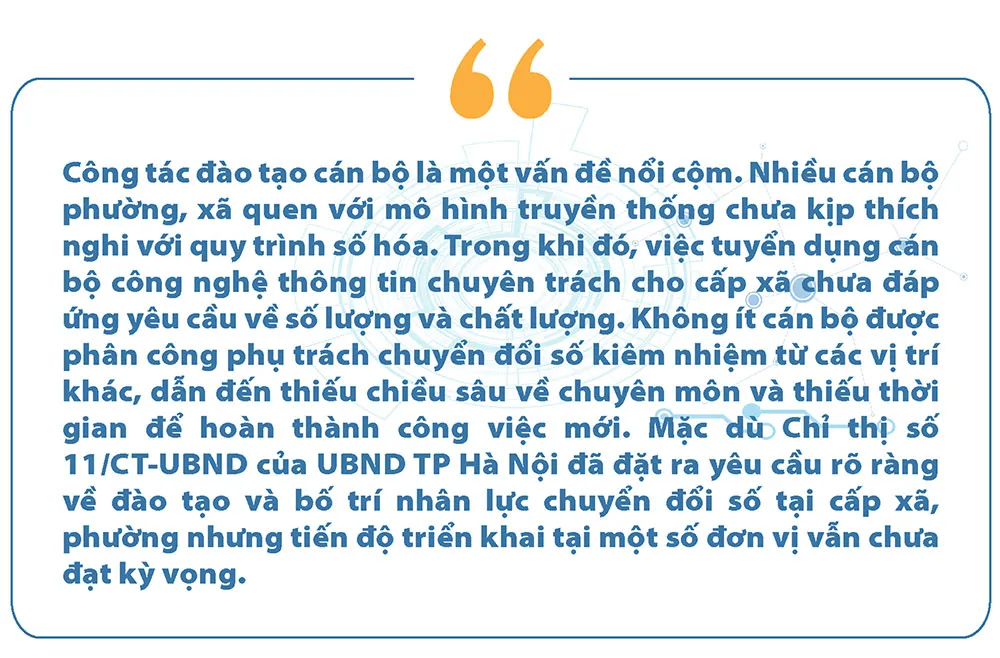 Thêm một trở ngại nữa là, ở nhiều vùng ven đô, các xã mới sáp nhập, tình trạng “lõm sóng”, mạng yếu, thiết bị lỗi thời khiến cán bộ phải “vừa làm vừa vá”, ảnh hưởng đến tiến độ xử lý hồ sơ, tiếp nhận ý kiến người dân. Một số xã còn thiếu các phòng làm việc có thiết bị số hóa, chưa được kết nối ổn định với hệ thống điều hành của Thành phố. Chỉ thị 11 của UBND TP Hà Nội đã yêu cầu các sở, ngành phối hợp rà soát và đầu tư hoàn thiện hạ tầng số, nhưng việc triển khai đồng loạt vẫn cần thời gian, đặc biệt khi nhiều xã có xuất phát điểm rất khác nhau…
