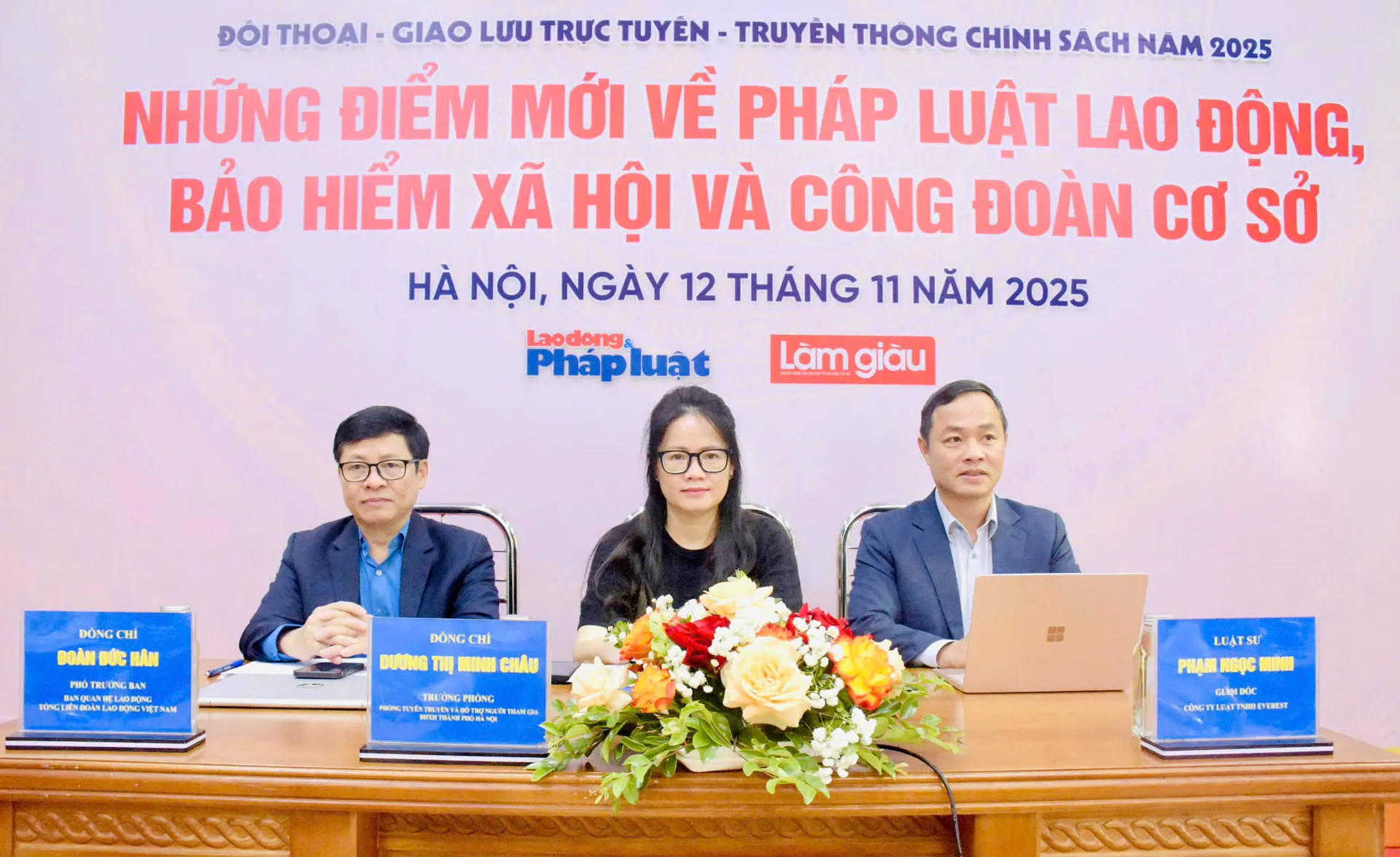 Tham gia buổi Đối thoại trực tiếp, giao lưu trực tuyến với chủ đề “Những điểm mới về pháp luật lao động, bảo hiểm xã hội và Công đoàn cơ sở” là các chuyên gia giàu kinh nghiệm, bao gồm: ông Đoàn Đức Hân - Phó Trưởng Ban Quan hệ lao động Tổng Liên đoàn Lao động Việt Nam; bà Dương Thị Minh Châu - Trưởng Phòng Tuyên truyền và hỗ trợ người tham gia (Bảo hiểm xã hội TP Hà Nội); Luật sư Phạm Ngọc Minh - Giám đốc Công ty Luật TNHH Everest.