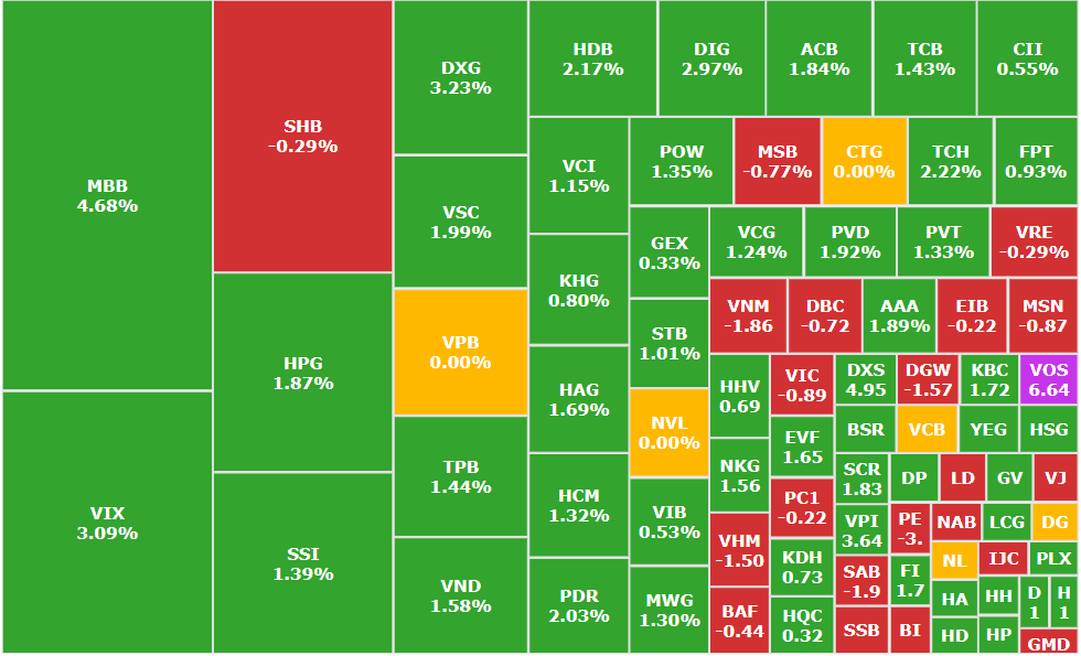 Kinhtedothi - Động lực của thị trường hôm nay đến từ sự luân chuyển dòng tiền đầy hiệu quả khi nhóm ngân hàng tạm “nghỉ ngơi”, trong khi bất động sản và dịch vụ tài chính kịp thời bứt phá để dẫn dắt xu hướng chung.
