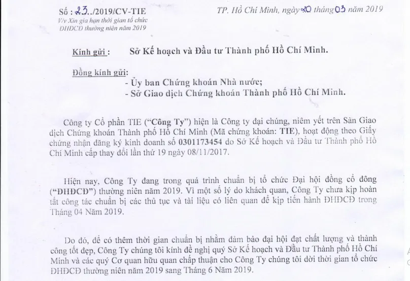 Đó là thông báo xin hoãn “Đại hội đồng cổ đông thường niên vào tháng 4/2019”. Ngoài ra, TIE còn liên quan đến đơn tố cáo về việc thoái vốn gây thất thoát hàng nghìn tỷ đồng với Tổng Công ty Công nghiệp Sài Gòn (CNS). Cụ thể, cơ quan điều tra Bộ Công an đã yêu cầu CNS cung cấp tài liệu phục vụ việc điều tra một số vụ thoái vốn, chuyển nhượng cổ phần có dấu hiệu sai phạm, gây thất thoát tài sản Nhà nước.