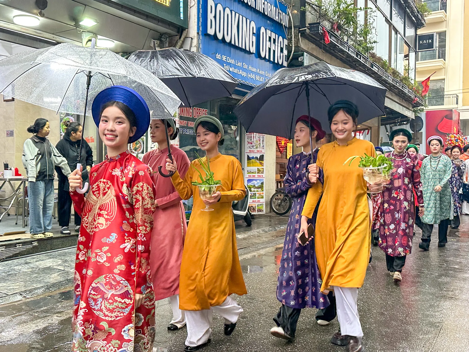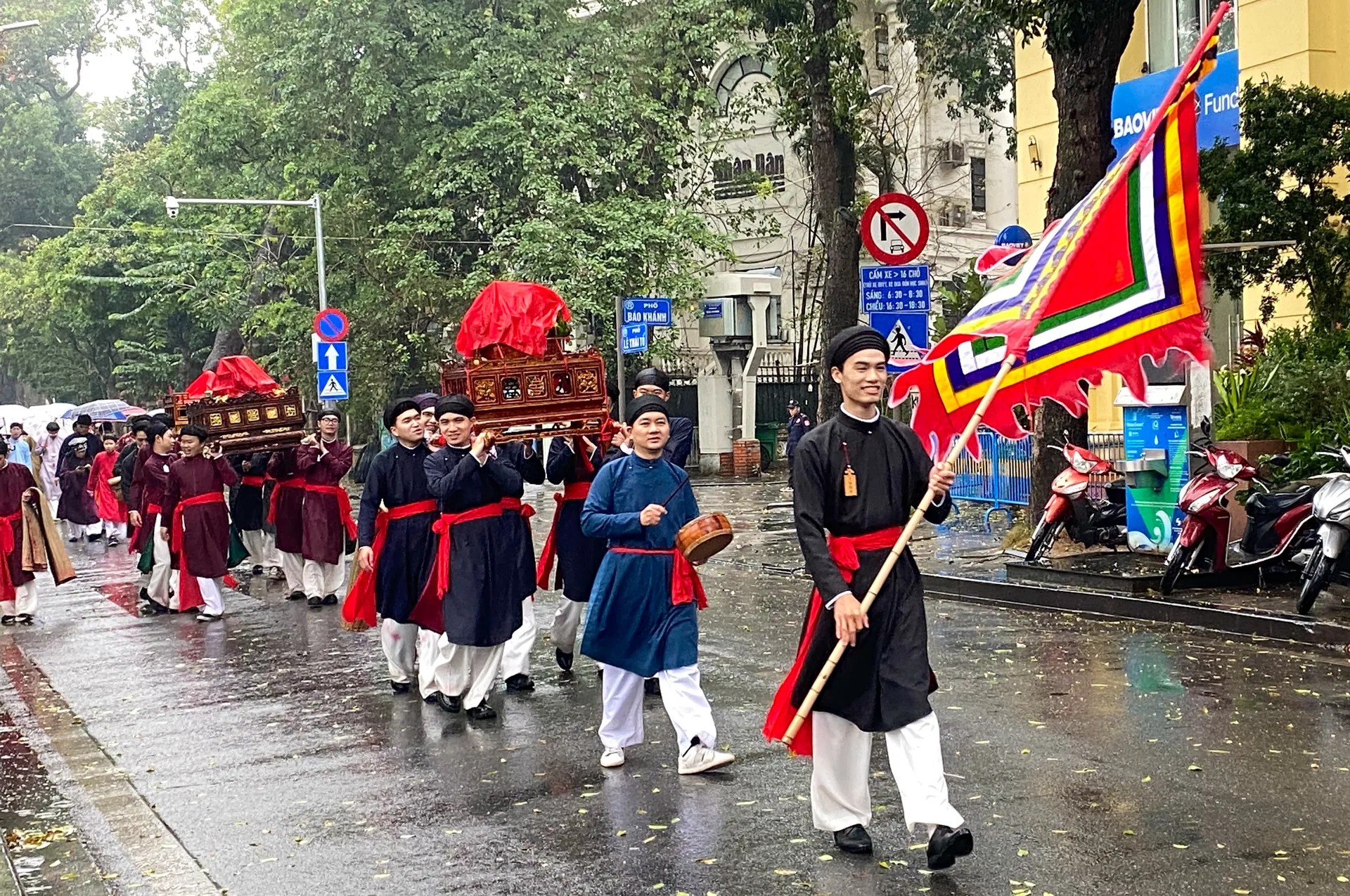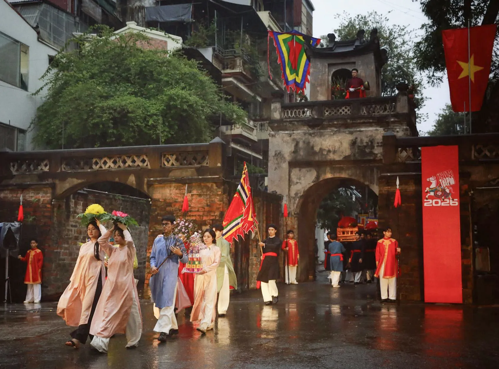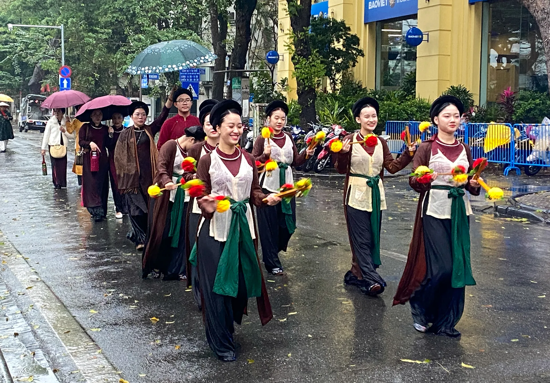 Dưới cơn mưa nặng hạt, đoàn người vẫn rộn rã tiếng cười và tràn ngập niềm tự hào về các giá trị văn hóa truyền thống của dân tộc.