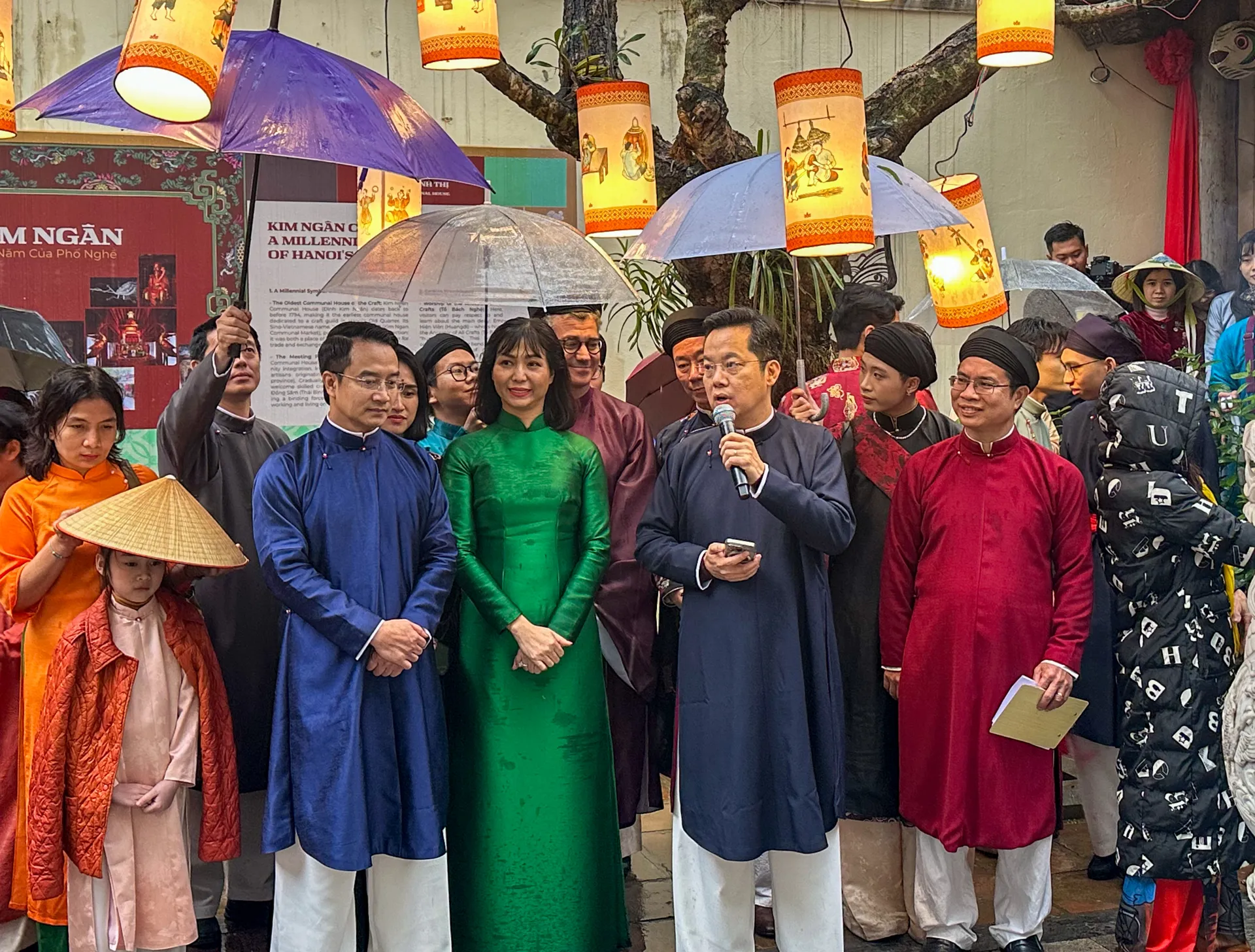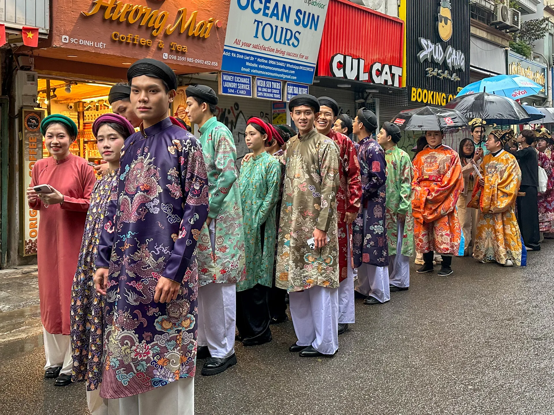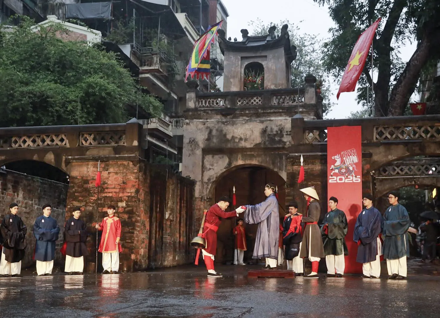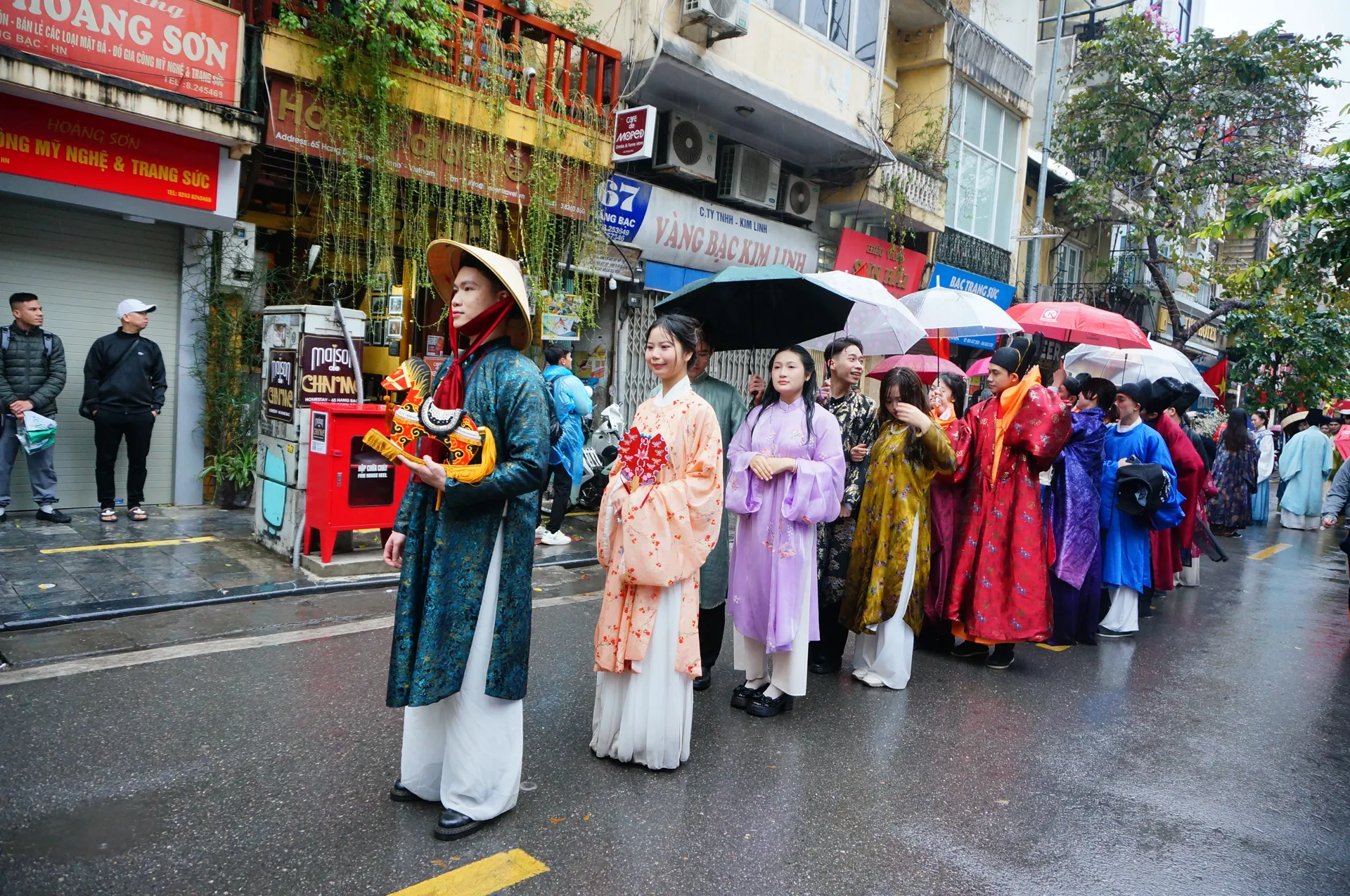 Dưới cơn mưa nặng hạt, đoàn người vẫn rộn rã tiếng cười và tràn ngập niềm tự hào về các giá trị văn hóa truyền thống của dân tộc.