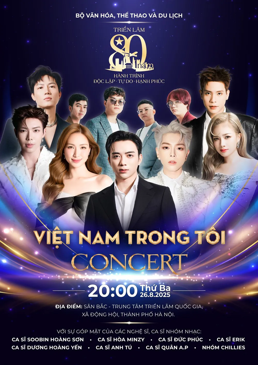 Concert "Việt Nam trong tôi" do Bộ VHTT&DL chỉ đạo, Nhà hát Lớn Hà Nội thực hiện, với sự phối hợp của các đơn vị liên quan. Đây là một phần trong chuỗi hoạt động Triển lãm thành tựu kinh tế - xã hội nhân dịp kỷ niệm 80 năm Ngày Quốc khánh (2/9/1945 – 2/9/2025), nhằm tôn vinh giá trị lịch sử và tinh thần dân tộc.